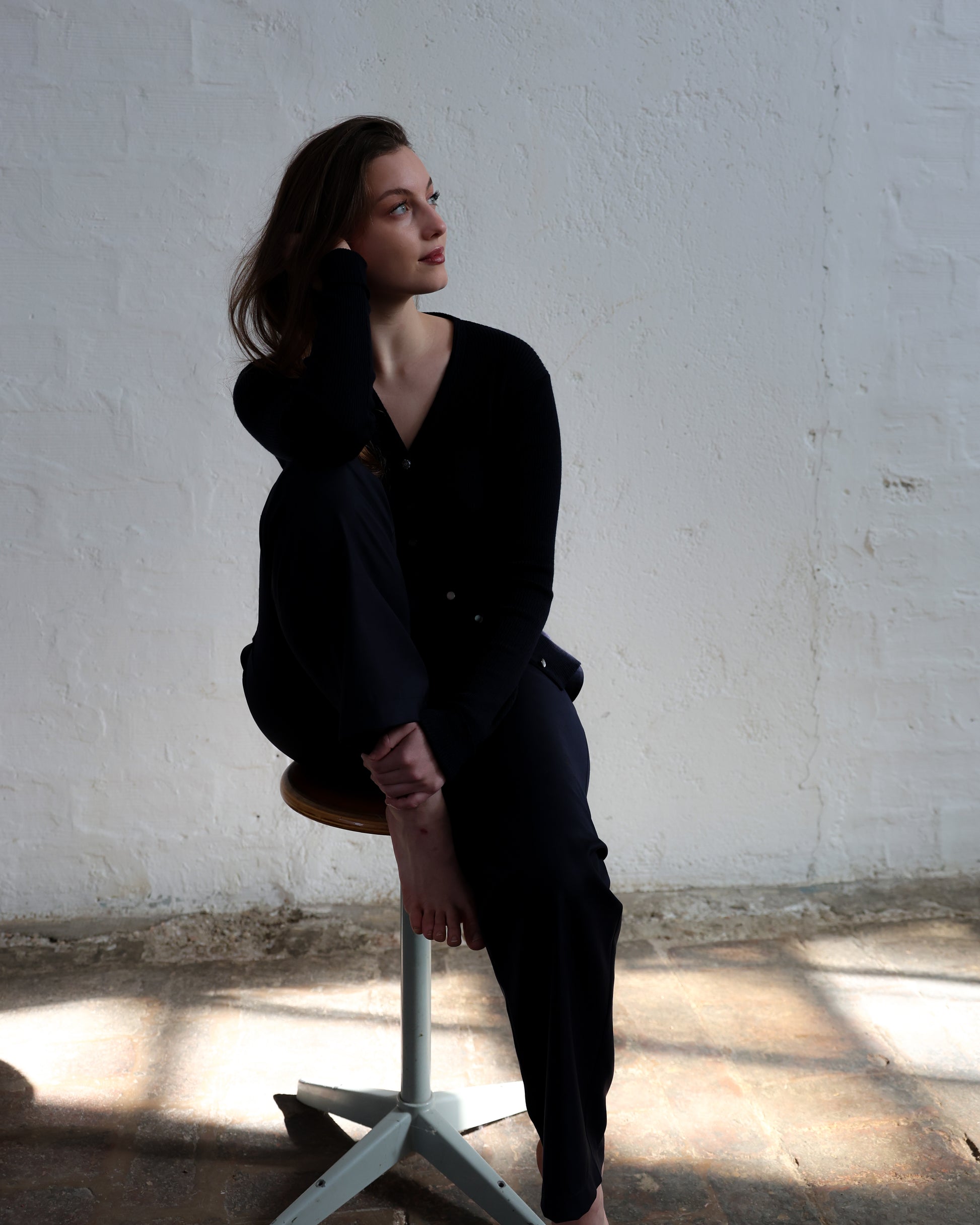 La struttura è a costine, una lavorazione che conferisce al cardigan un'elasticità naturale e una tridimensionalità visiva propria della grande maglieria artigianale. La vestibilità è aderente al corpo, pensata per valorizzare la silhouette, ma grazie all'elasticità intrinseca della costina si adatta con facilità a ogni fisicità senza mai costringere. Un capo che abbraccia, non che limita.