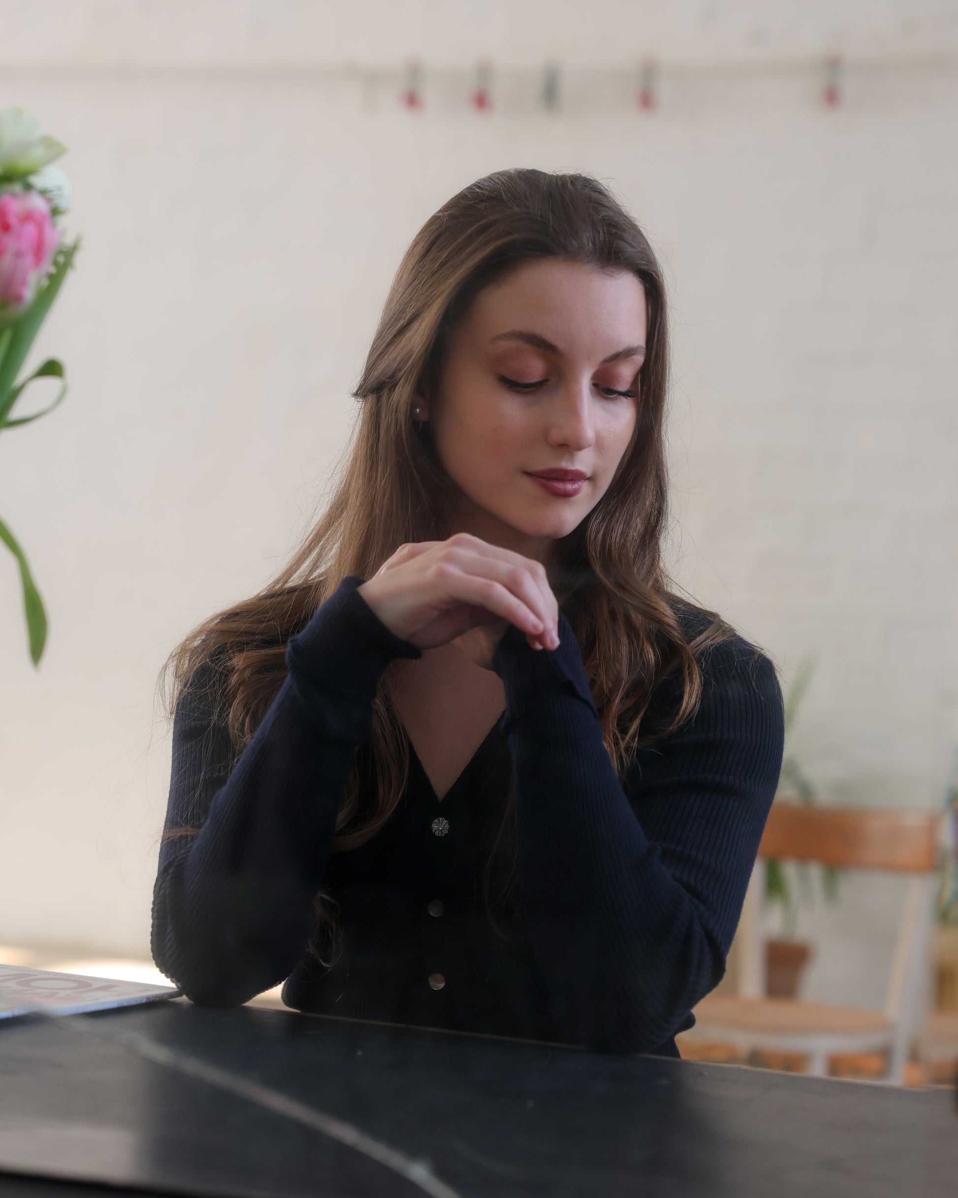 I bottoni sono tutti Made in Italy e raccontano una storia di contrasti sapientemente calibrati. Il primo bottone è un gioiello: impreziosito da strass di cristallo, cattura la luce e trasforma un gesto quotidiano — quello di abbottonarsi — in un dettaglio di stile. Gli altri bottoni sono in vera madreperla river, con la loro iridescenza naturale e il loro lustro delicato. Un gioco tra preziosità e raffinatezza che rende ogni cardigan immediatamente riconoscibile.