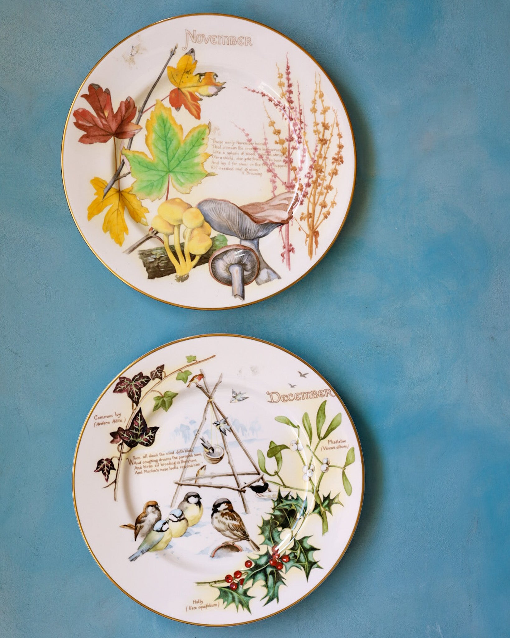 Ogni piatto racconta la storia di un mese attraverso composizioni artistiche accuratamente studiate: foglie autunnali dai caldi toni ambrati e funghi per novembre, uccellini tra agrifoglio e bacche rosse per dicembre, fiori primaverili e farfalle per i mesi più miti. Le illustrazioni, realizzate con una palette cromatica delicata e naturalistica, mostrano una particolare attenzione ai dettagli botanici e ornitologici, riflettendo la tradizione inglese delle incisioni naturalistiche vittoriane.