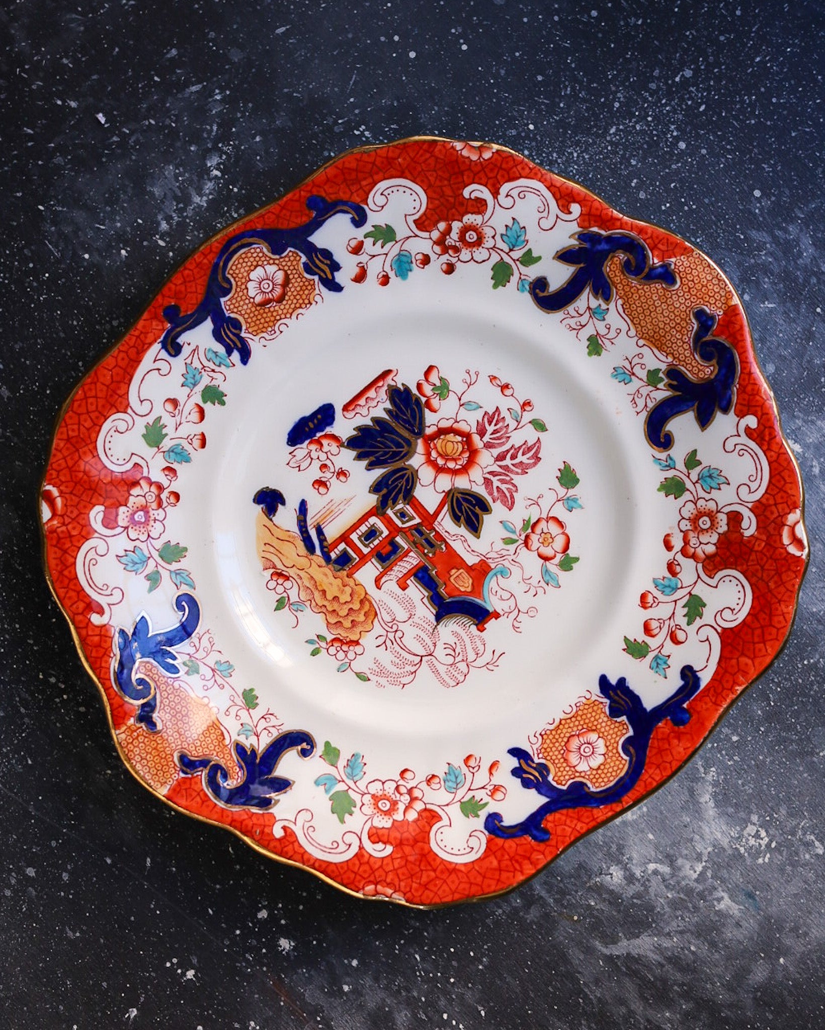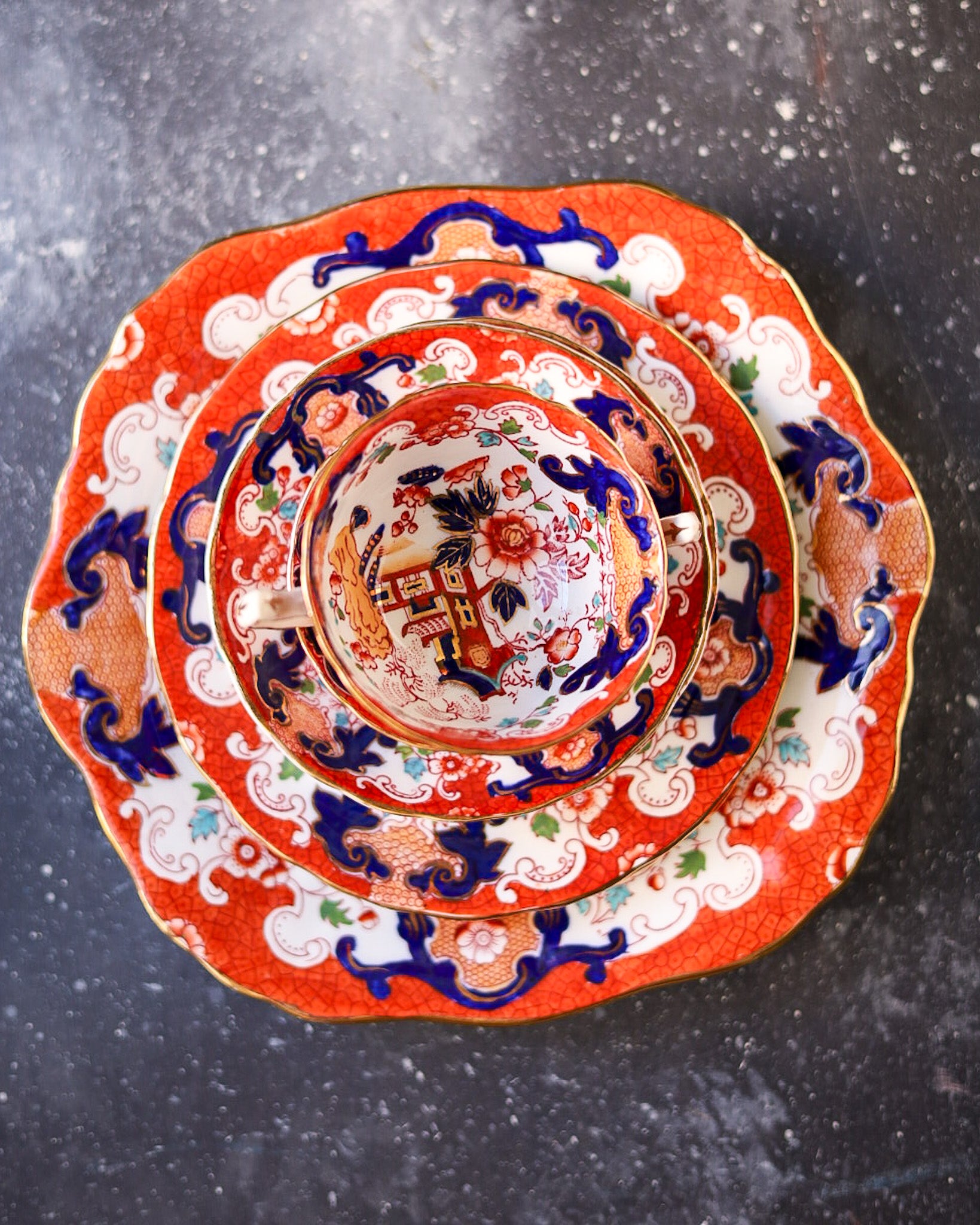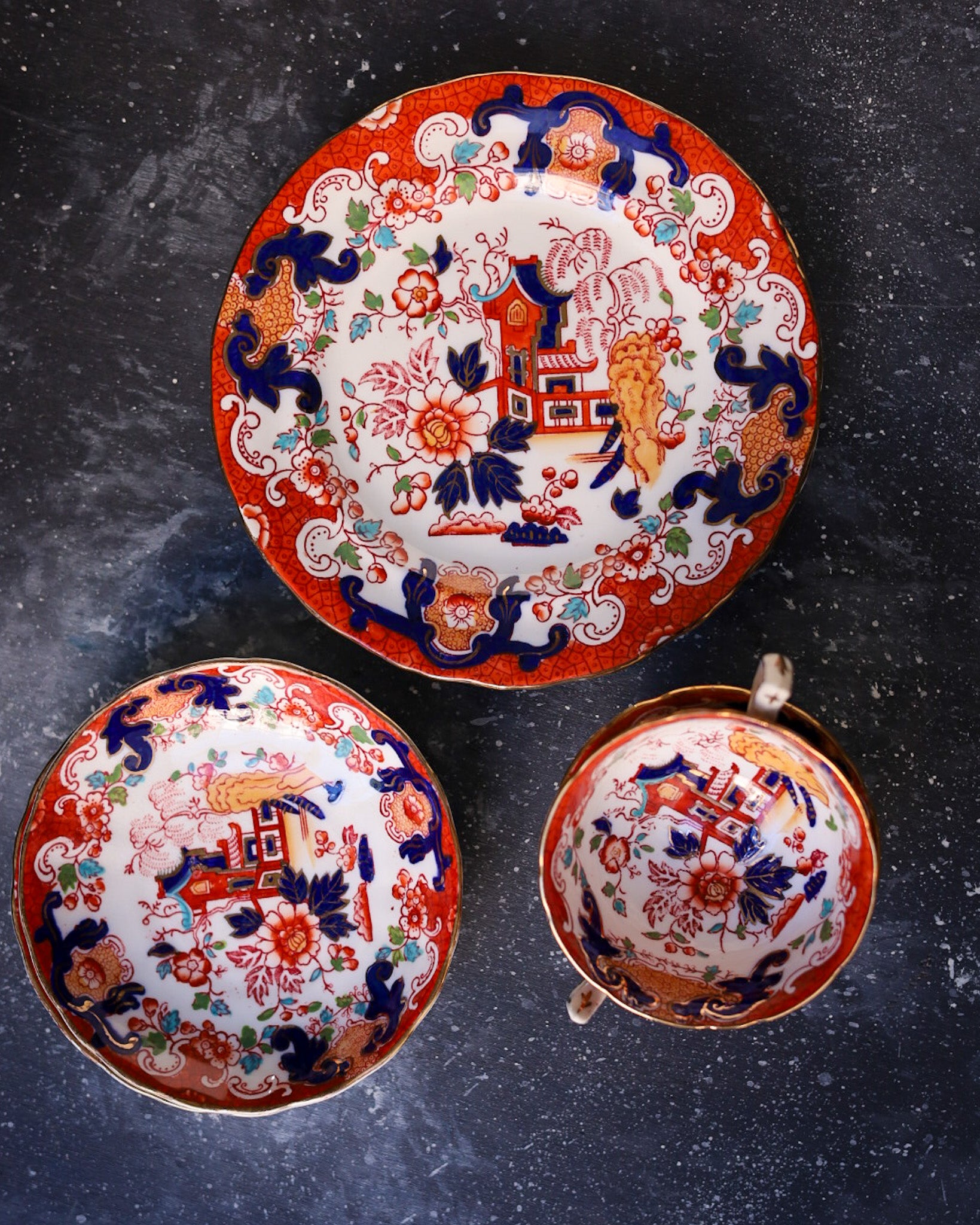 coppia tris tazze chinoiserie con bordo rosso e piatto torta