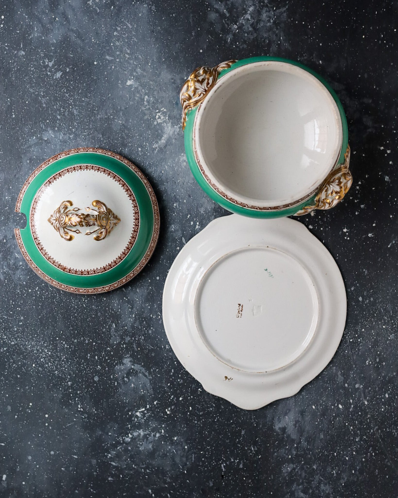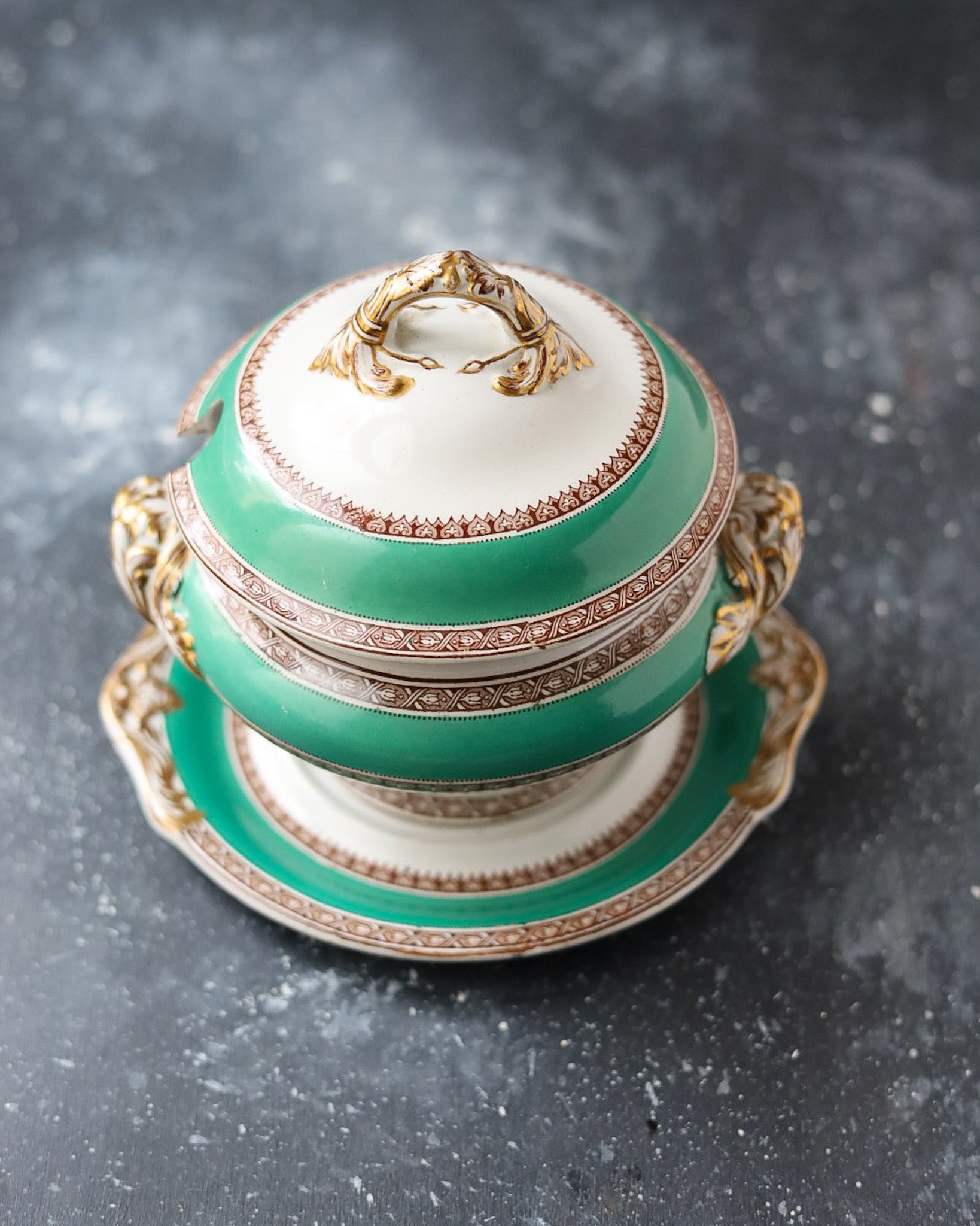 Salsiera con Coperchio e Piattino - Verde Smeraldo e Oro - Bone China - Metà 1800