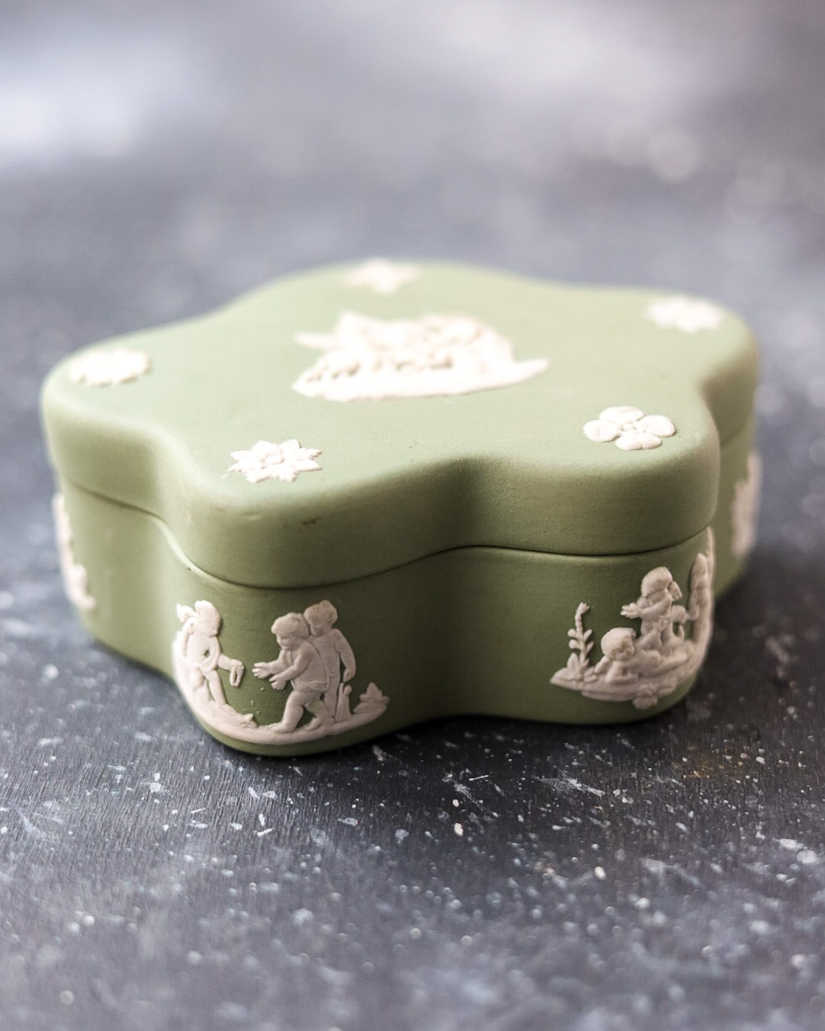 Queste raffinate scatole con coperchio incarnano la quintessenza dell'estetica neoclassica Wedgwood nella sua espressione più giocosa e delicata. Disponibili nel caratteristico blu celeste pallido – il celeberrimo "Wedgwood blue" divenuto sinonimo del marchio – e in una rarissima versione verde salvia che rappresenta una variante cromatica particolarmente ricercata dai collezionisti.