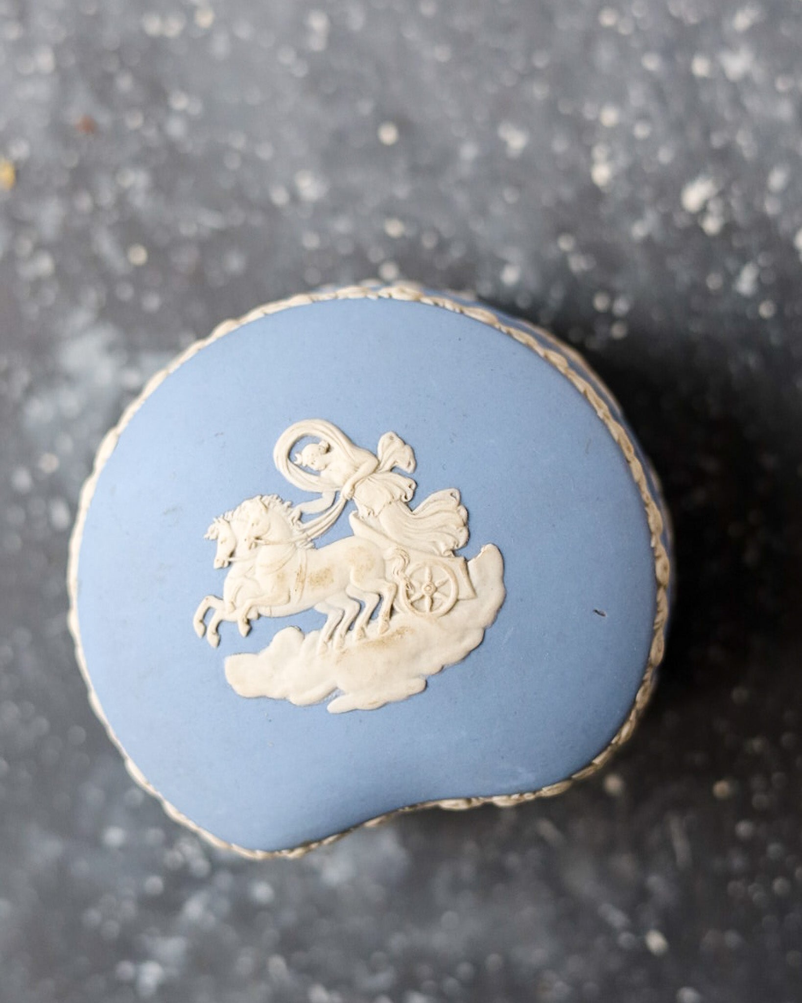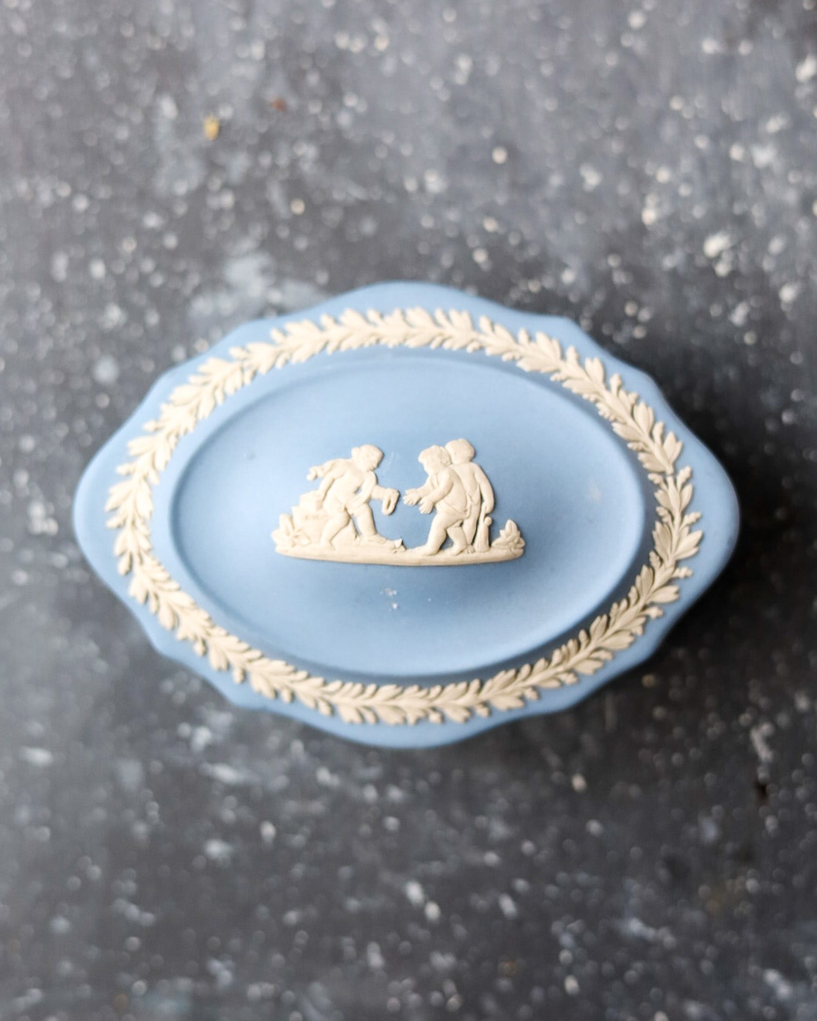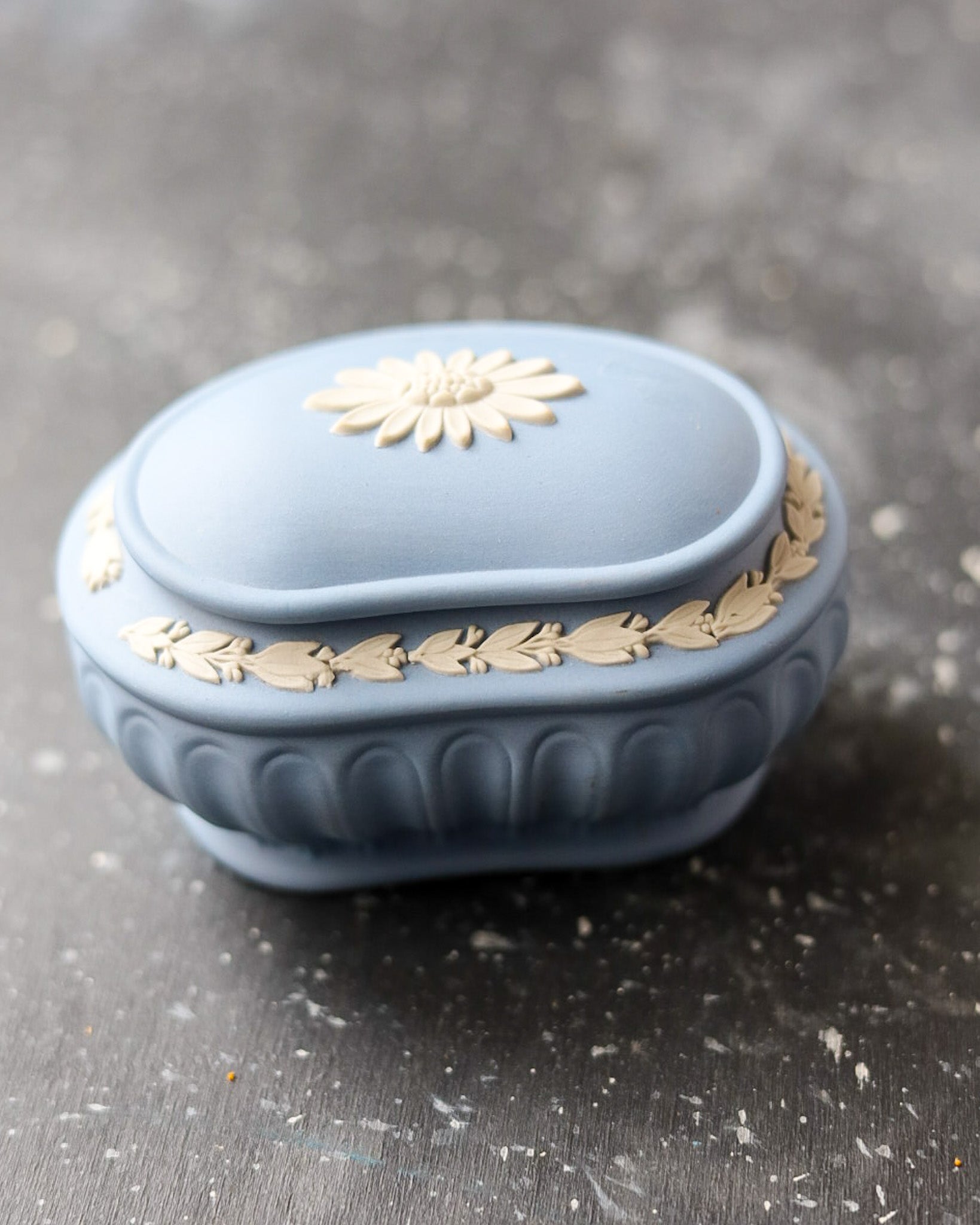 Queste raffinate scatole con coperchio incarnano la quintessenza dell'estetica neoclassica Wedgwood in una varietà di forme e dimensioni, ognuna con decorazioni uniche che le rendono piccoli capolavori individuali. Tutte realizzate nel caratteristico blu celeste pallido – il celeberrimo "Wedgwood blue" divenuto sinonimo del marchio – con elaborate decorazioni in bassorilievo bianco.