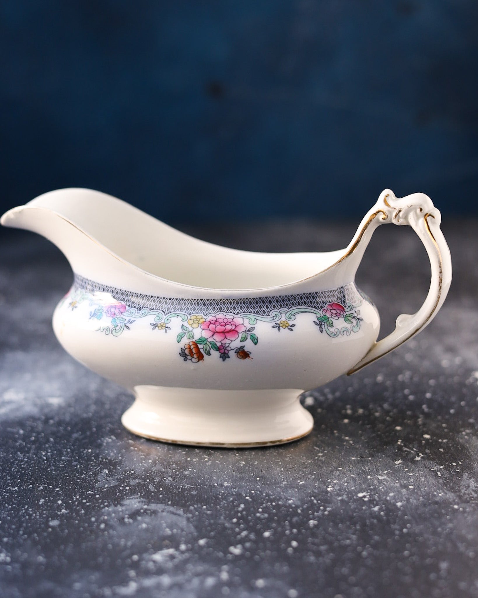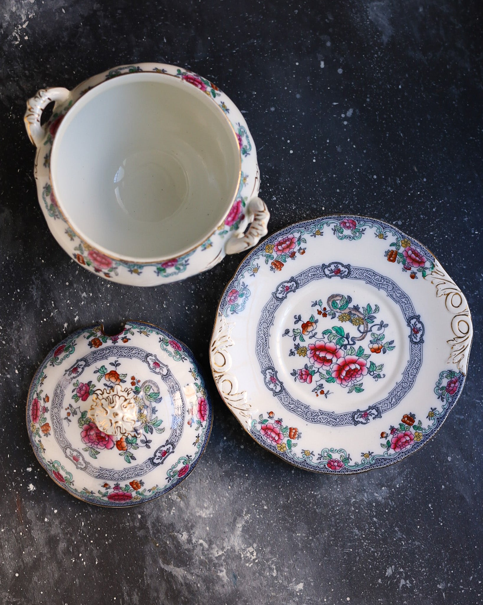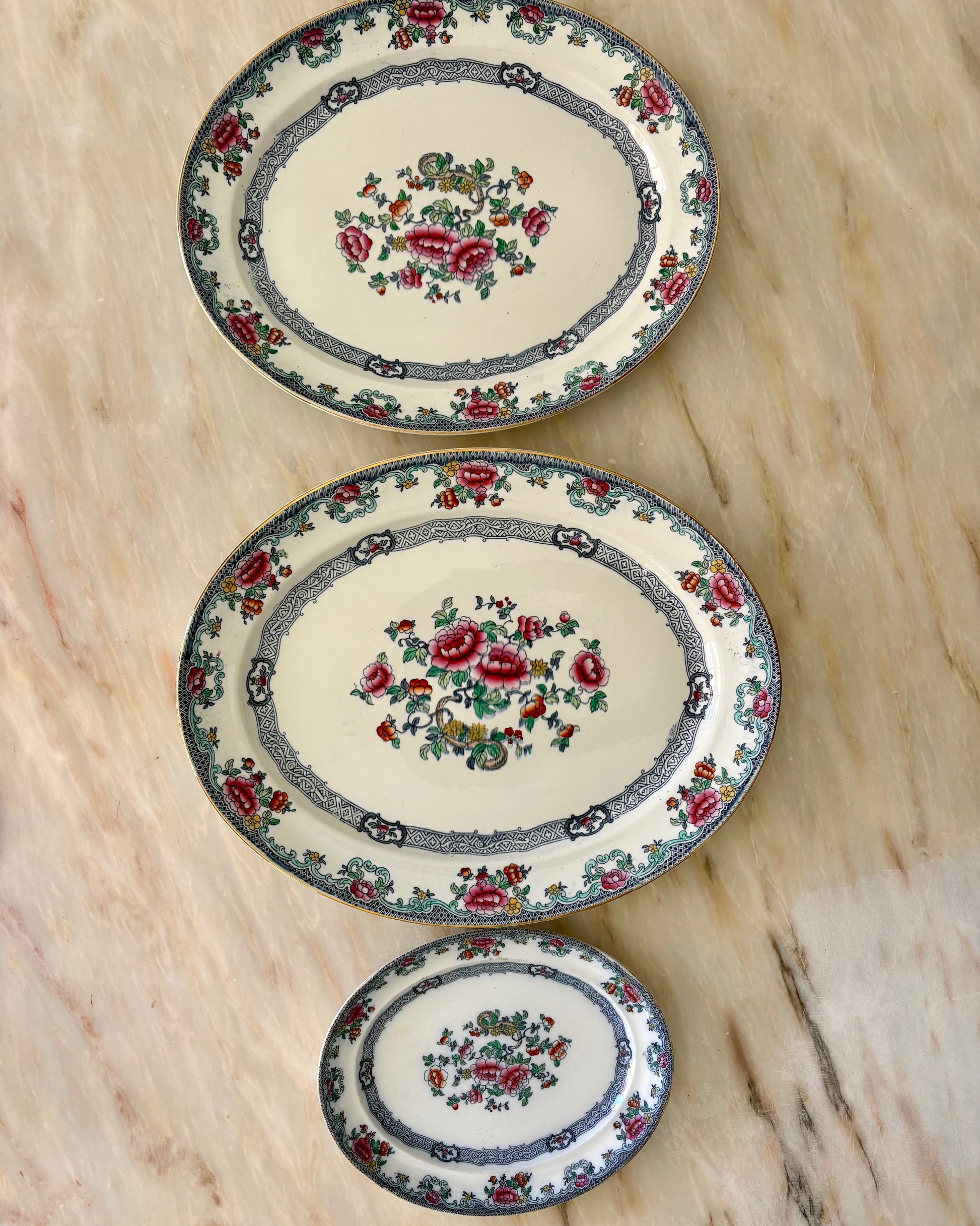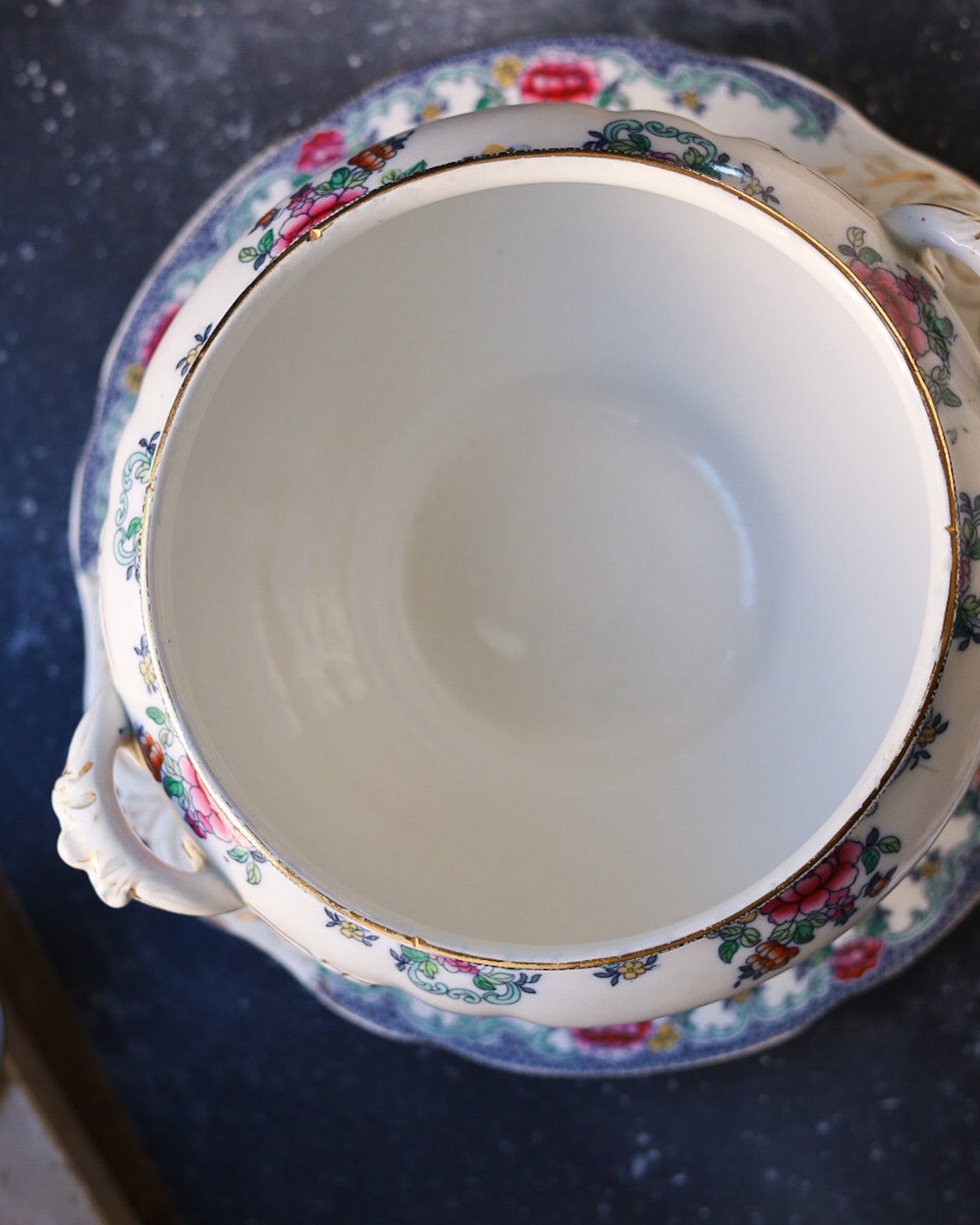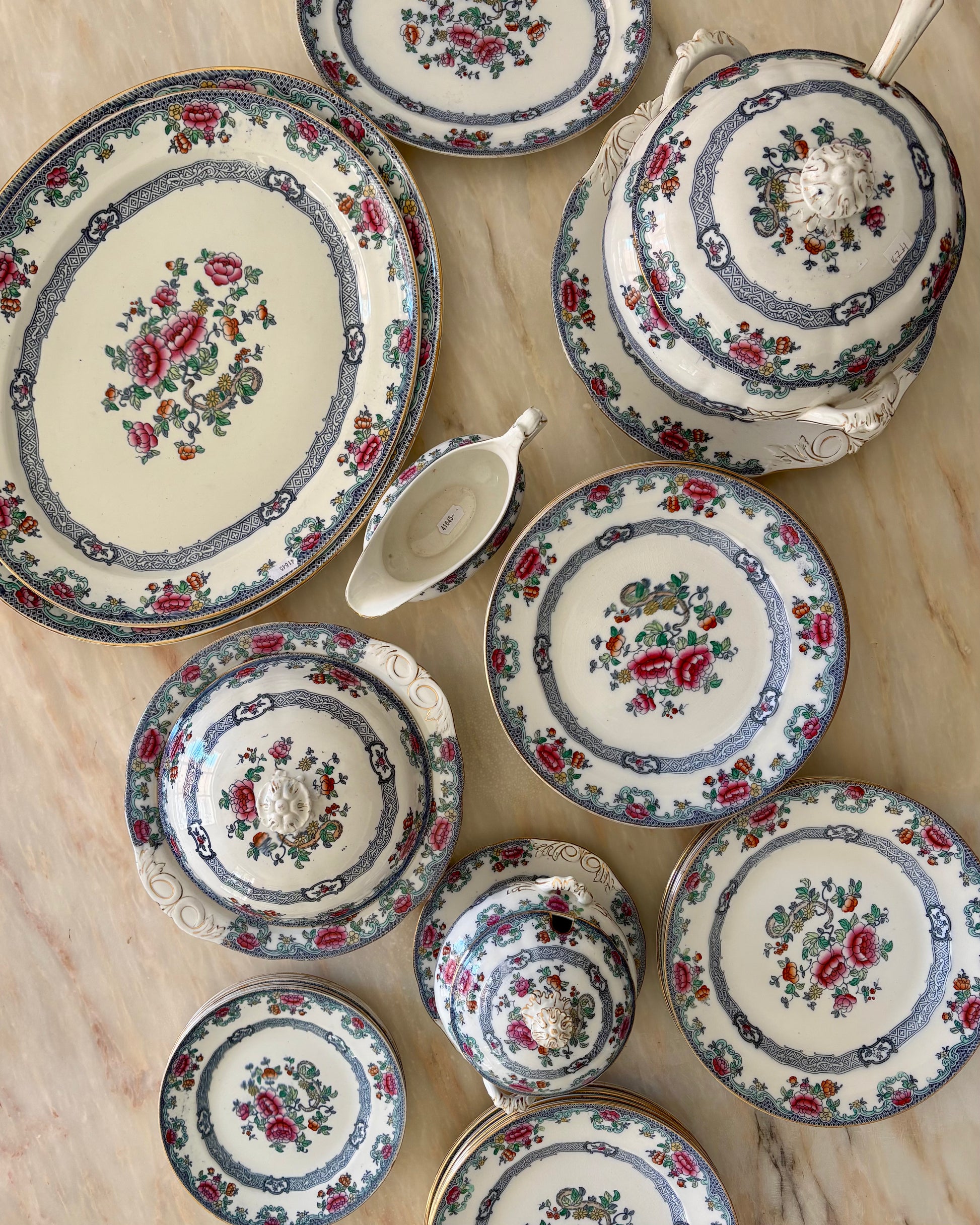 Raffinato servizio di piatti Royal Doulton nel celebre decoro "Mandarin", una delle decorazioni più ricercate della manifattura inglese. Questo pattern di ispirazione orientale, caratterizzato da eleganti rose e peonie policrome circondate da delicate bordure blu, riflette il fascino per la Cina che conquistò l'Europa tra fine Ottocento e inizio Novecento.