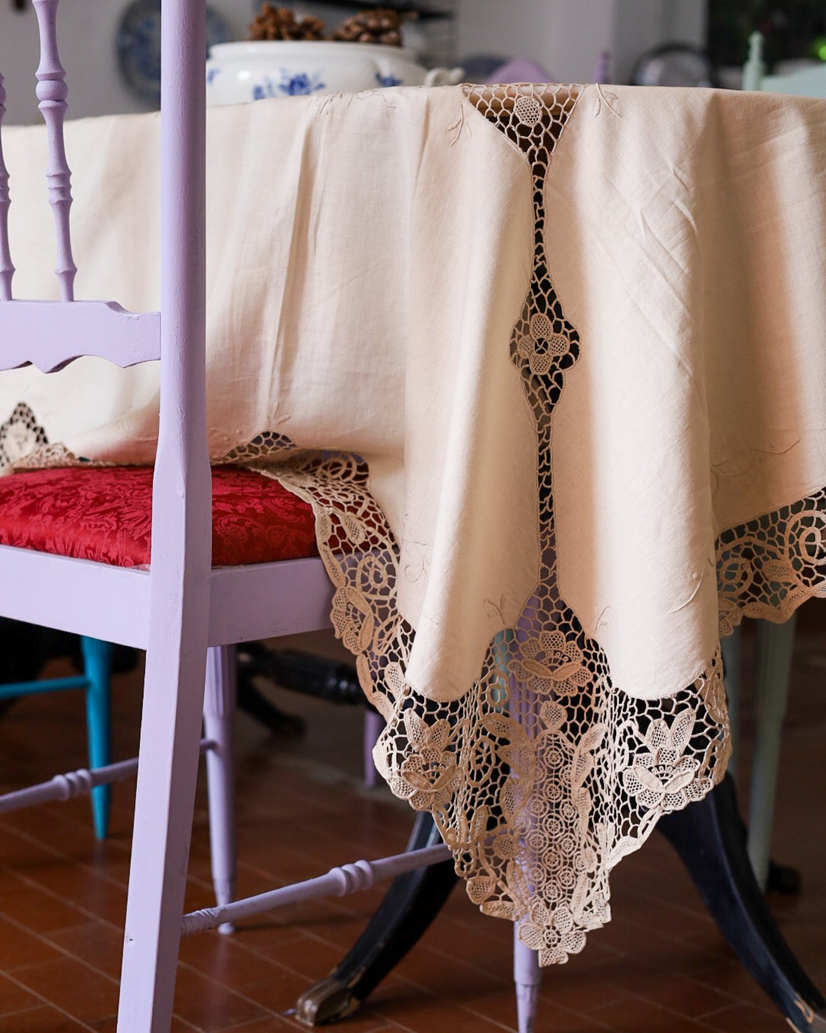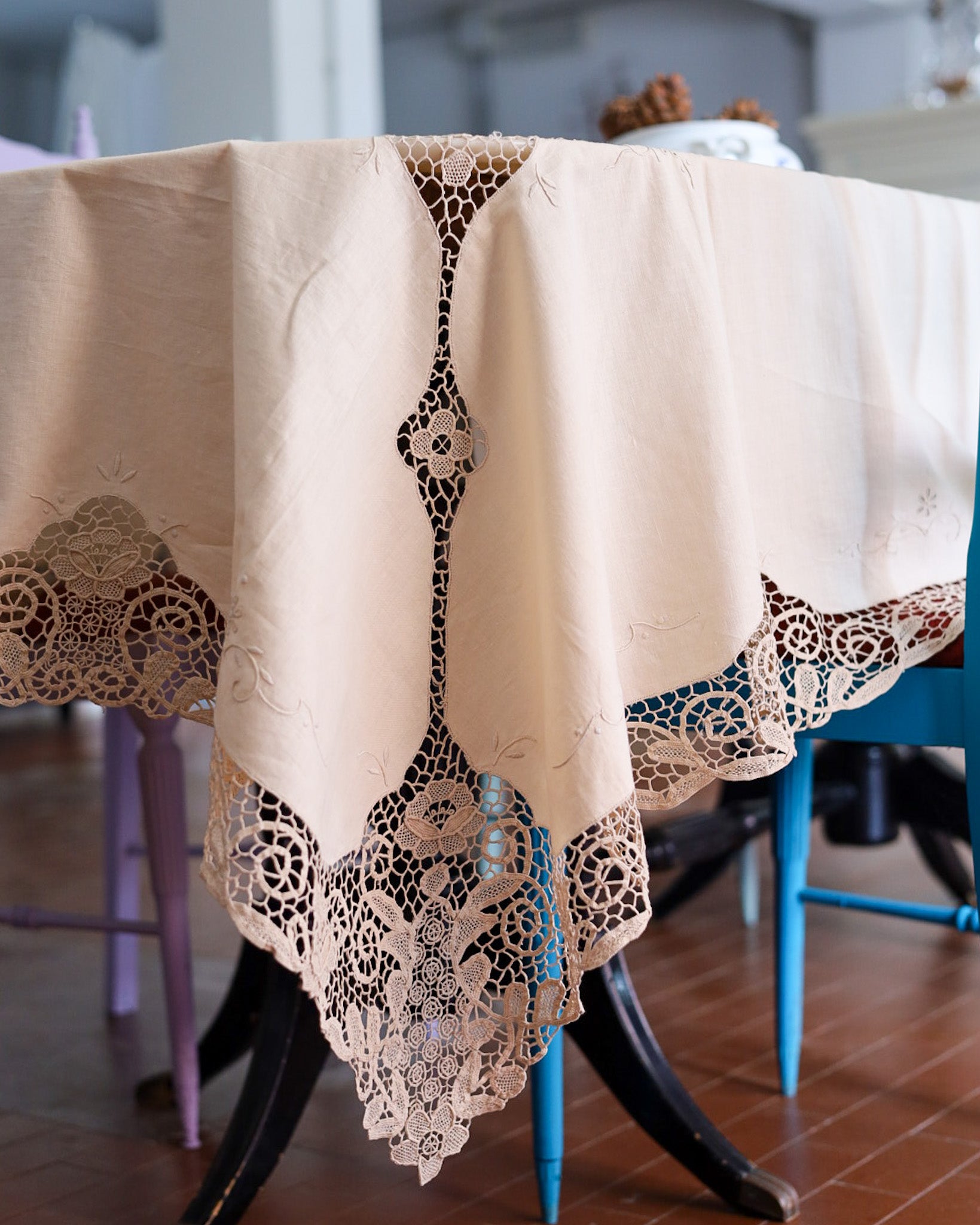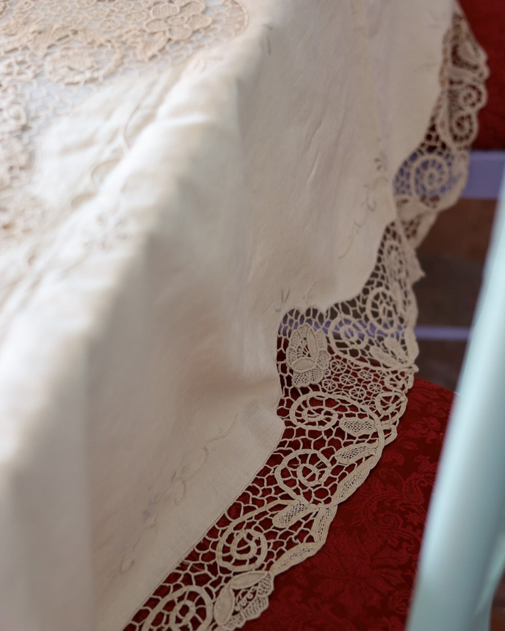 Meravigliosa tovaglia in lino avorio con pizzo Burano rinascimento