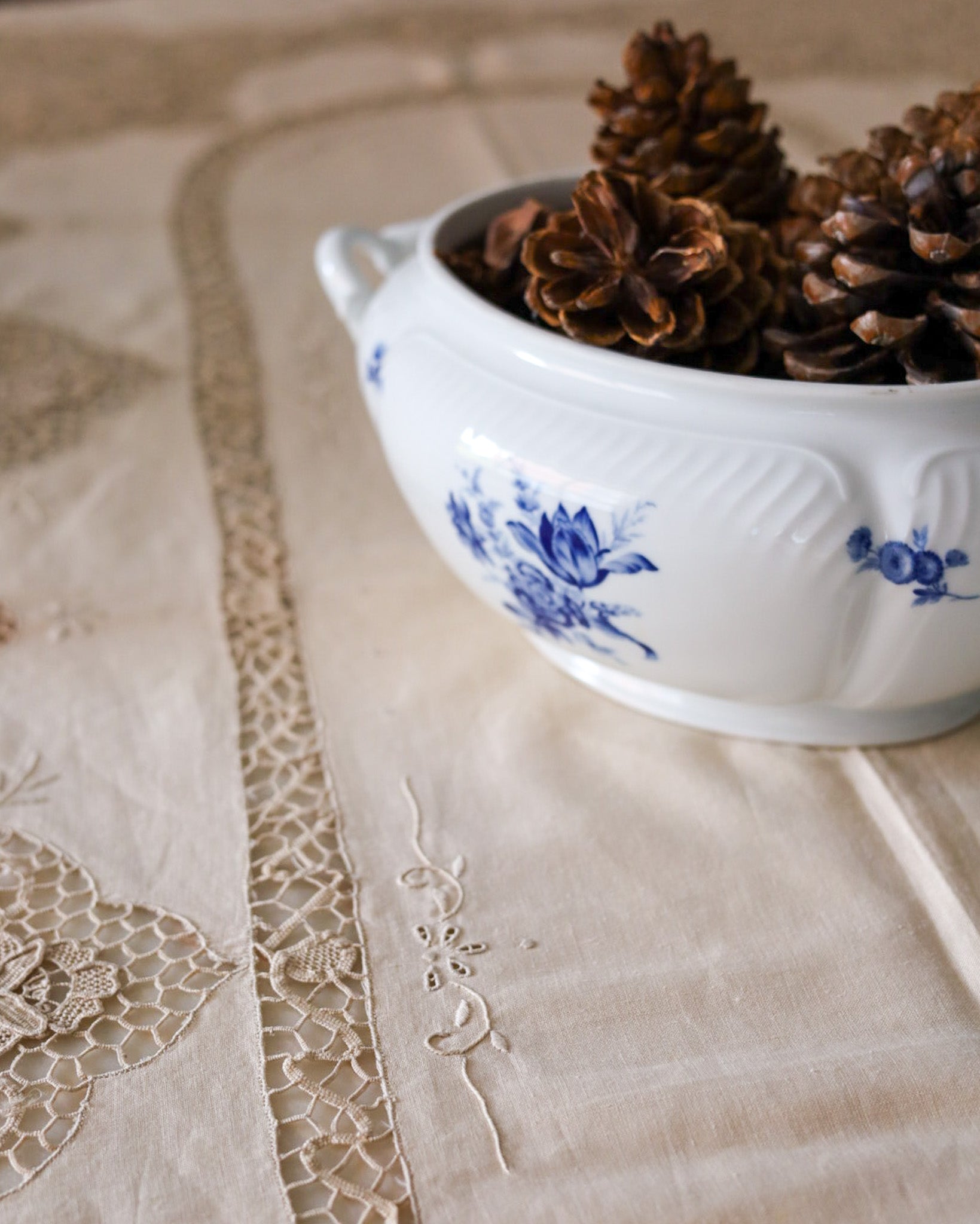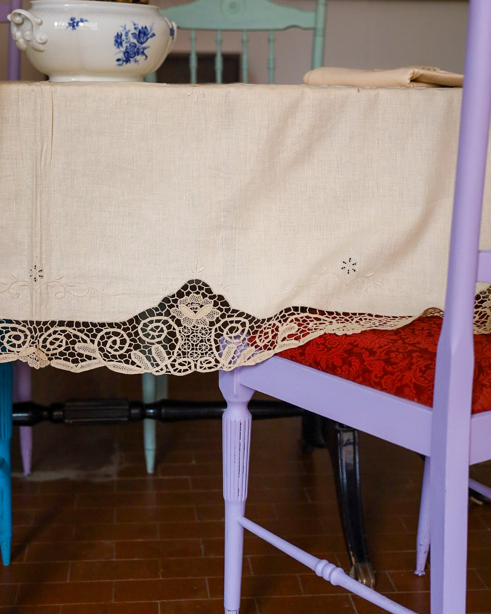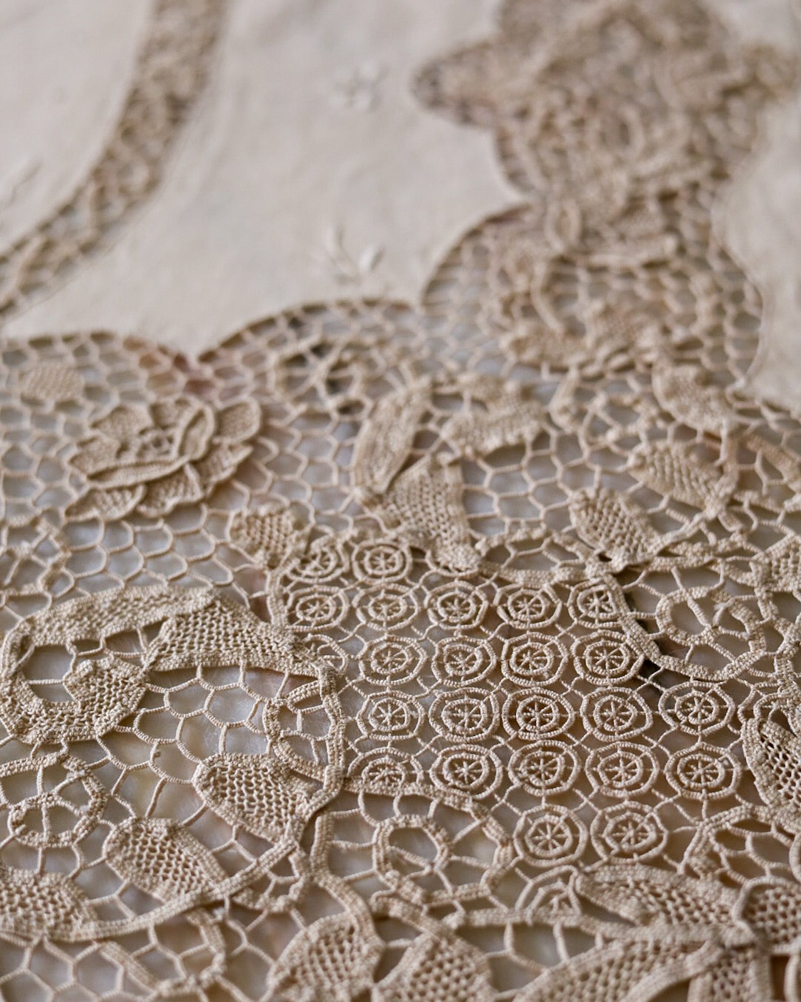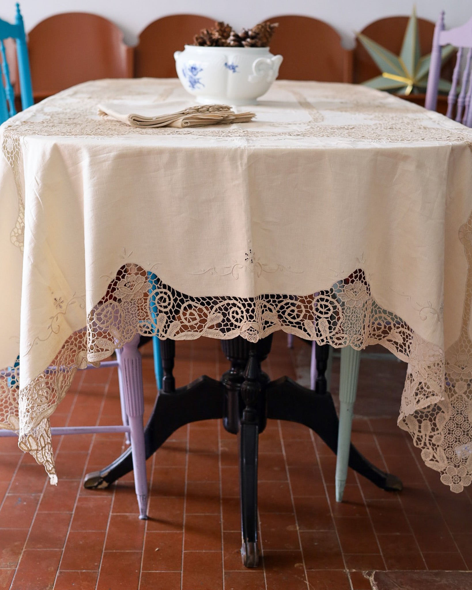 Meravigliosa tovaglia in lino avorio con pizzo Burano rinascimento
