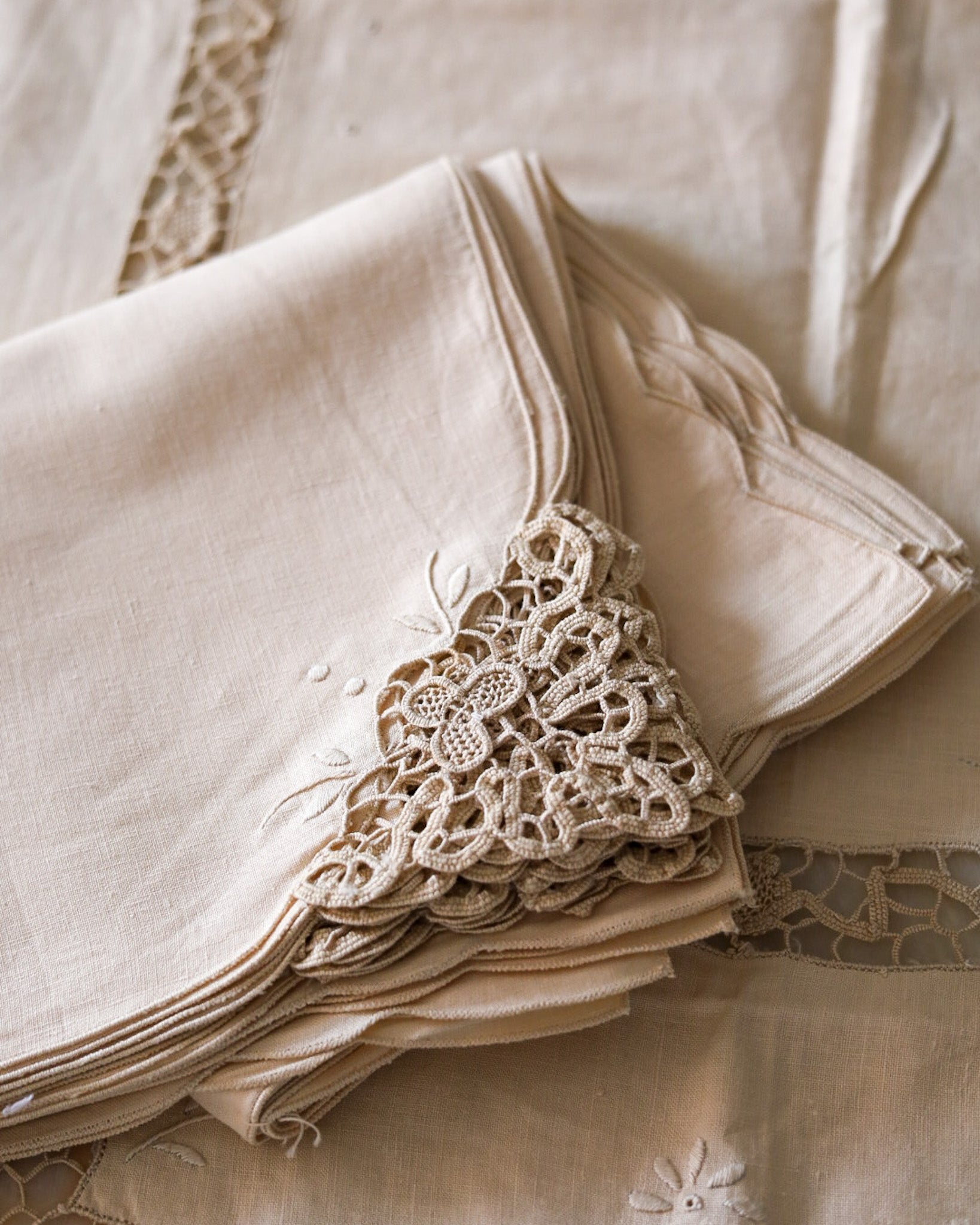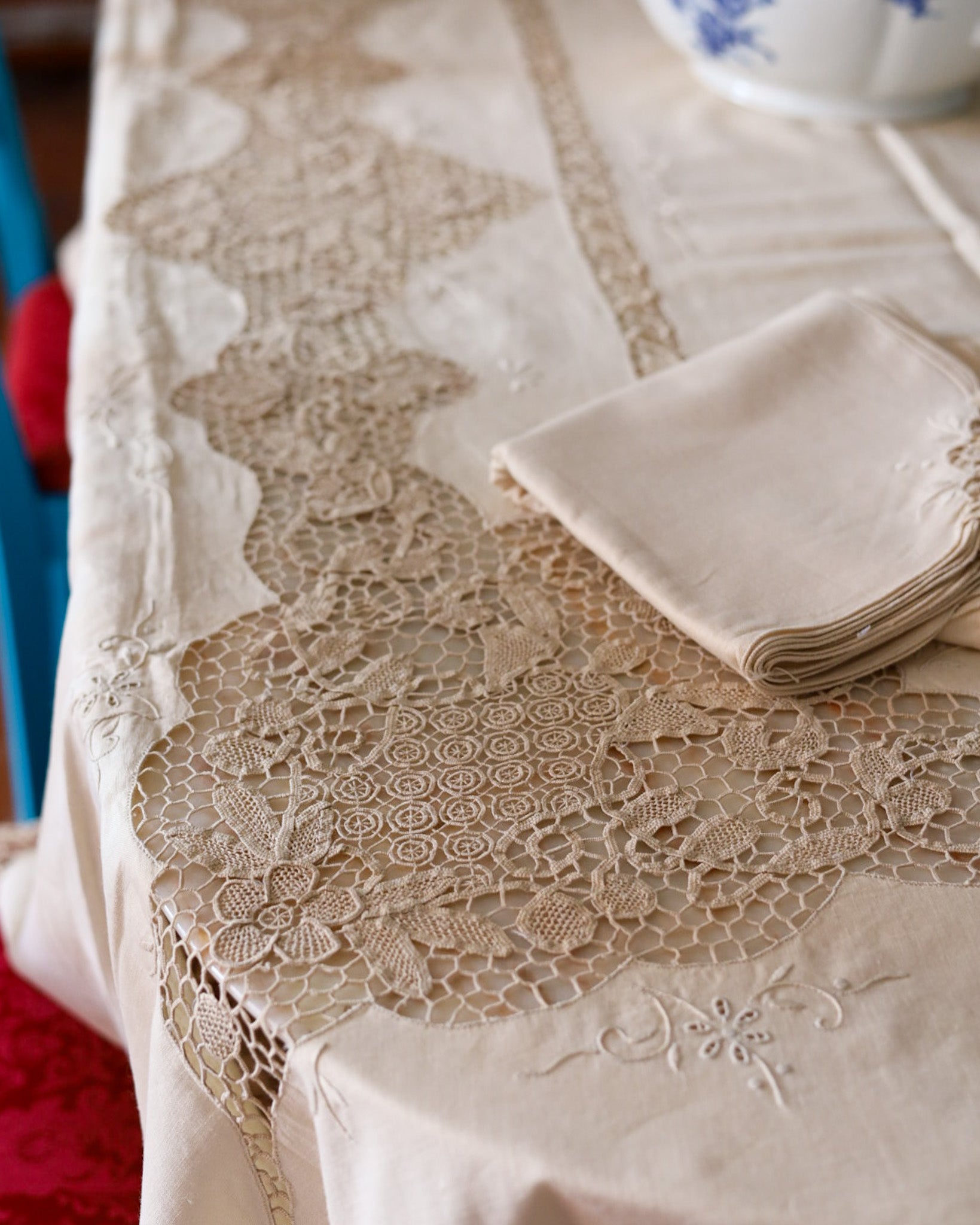 Tovaglia in lino avorio con 12 tovaglioli in pizzo burano rinascimento