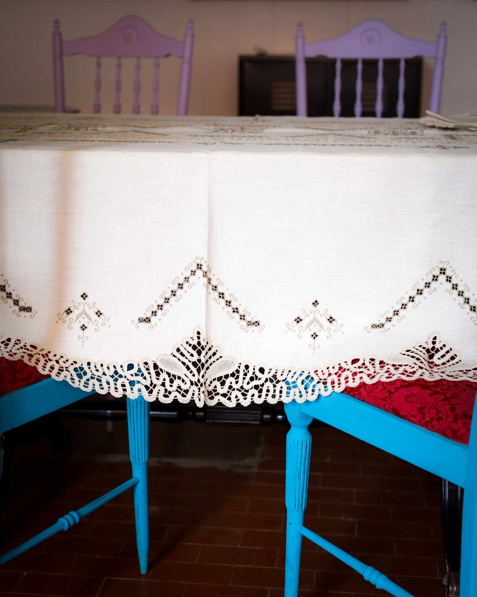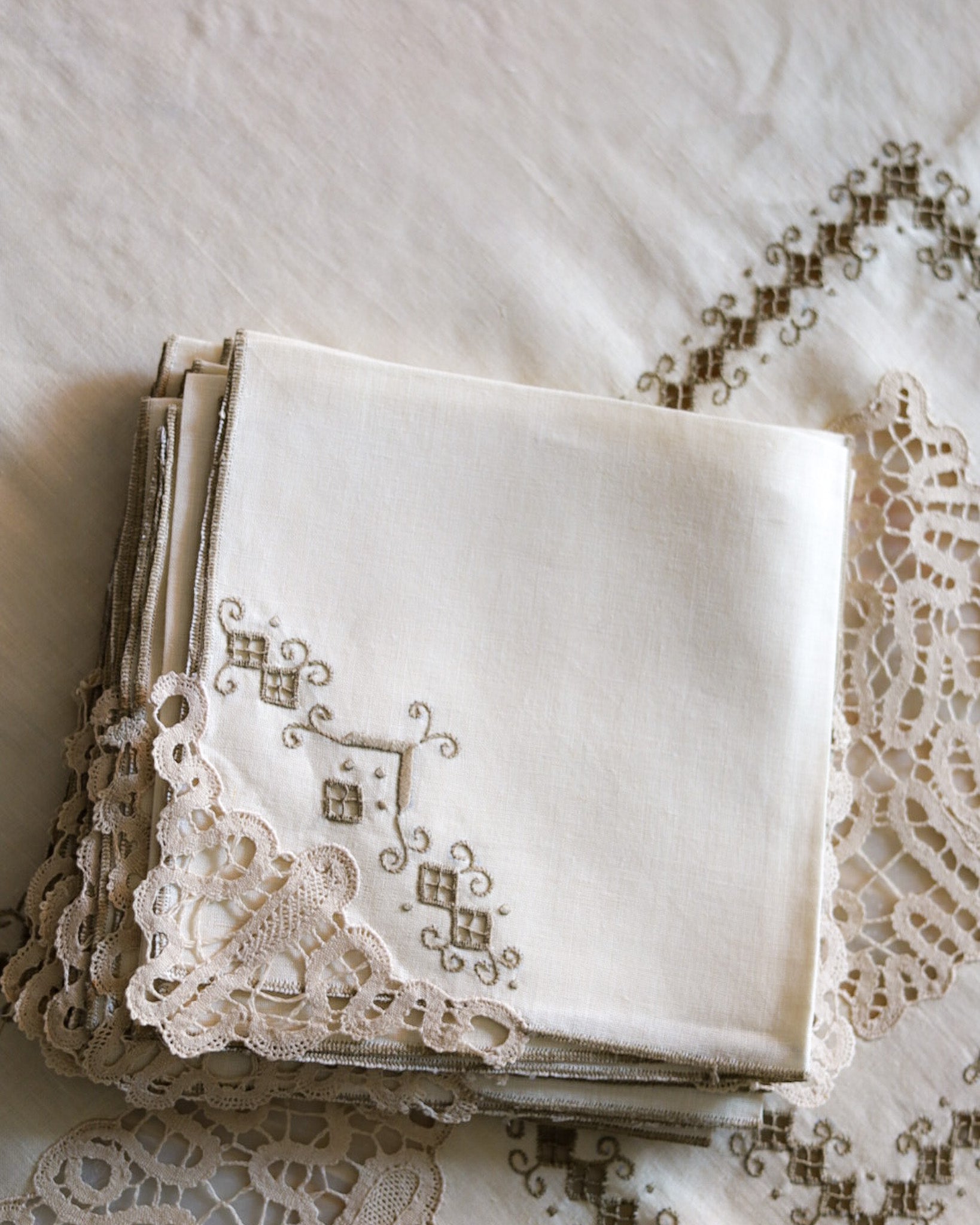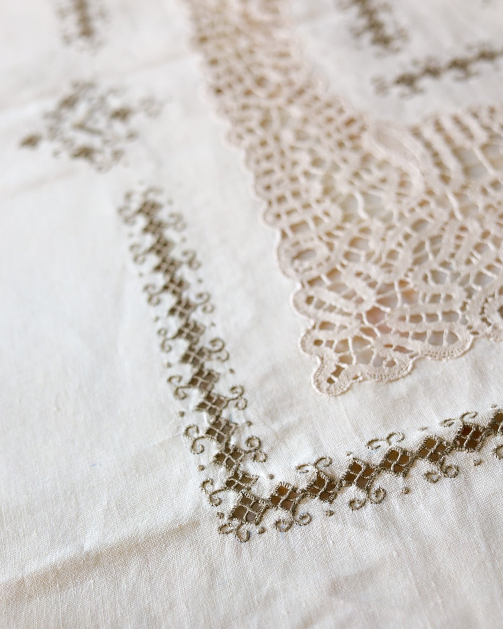 Tovaglia in lino avorio con pizzo a tombolo e ricamo punto antico