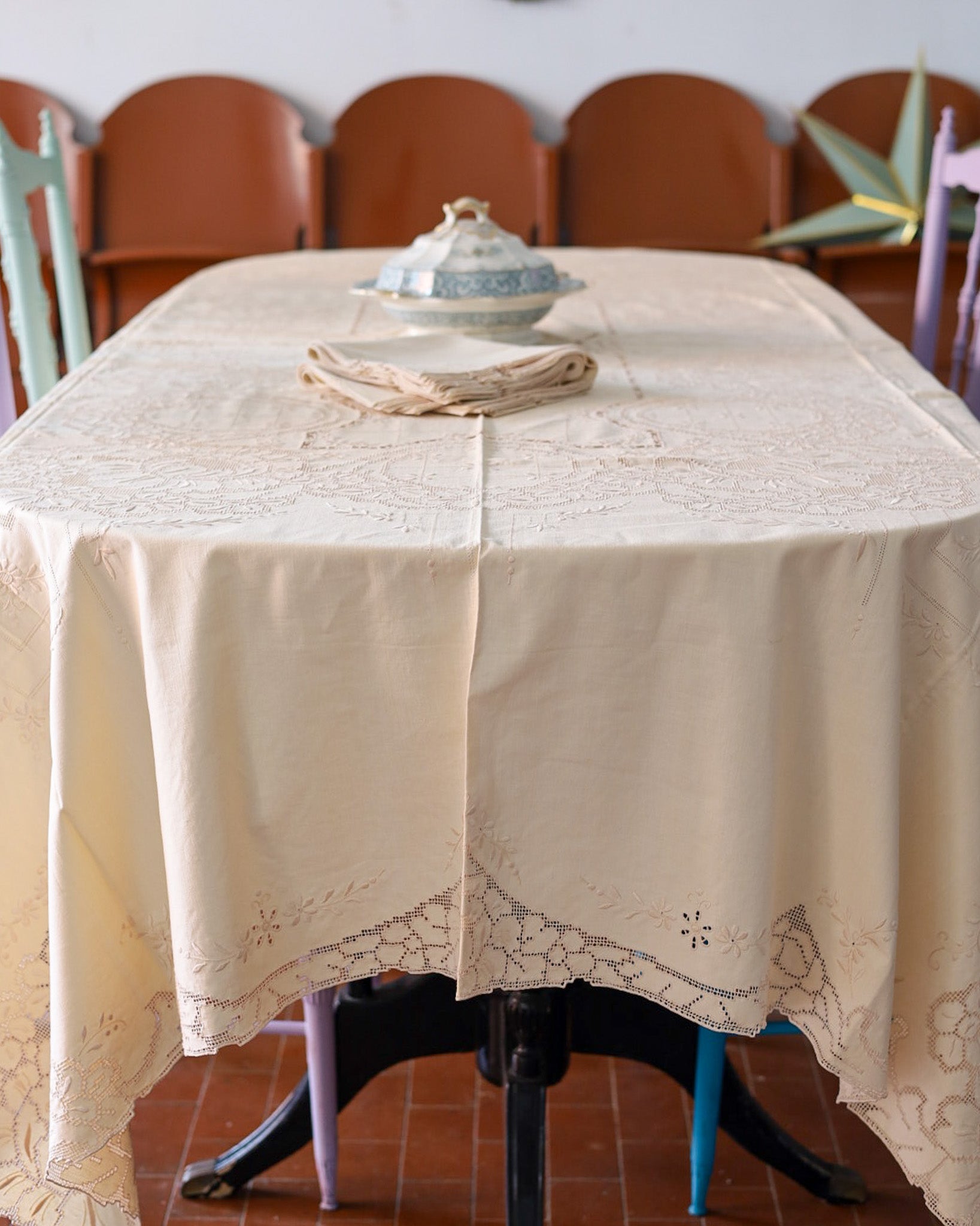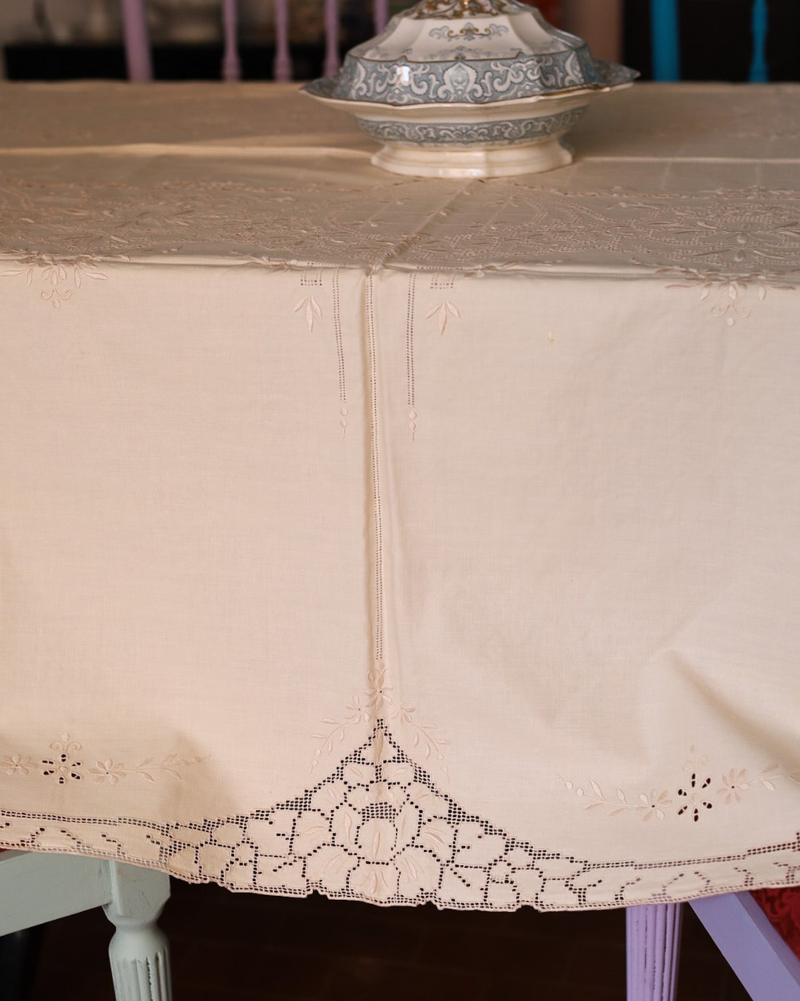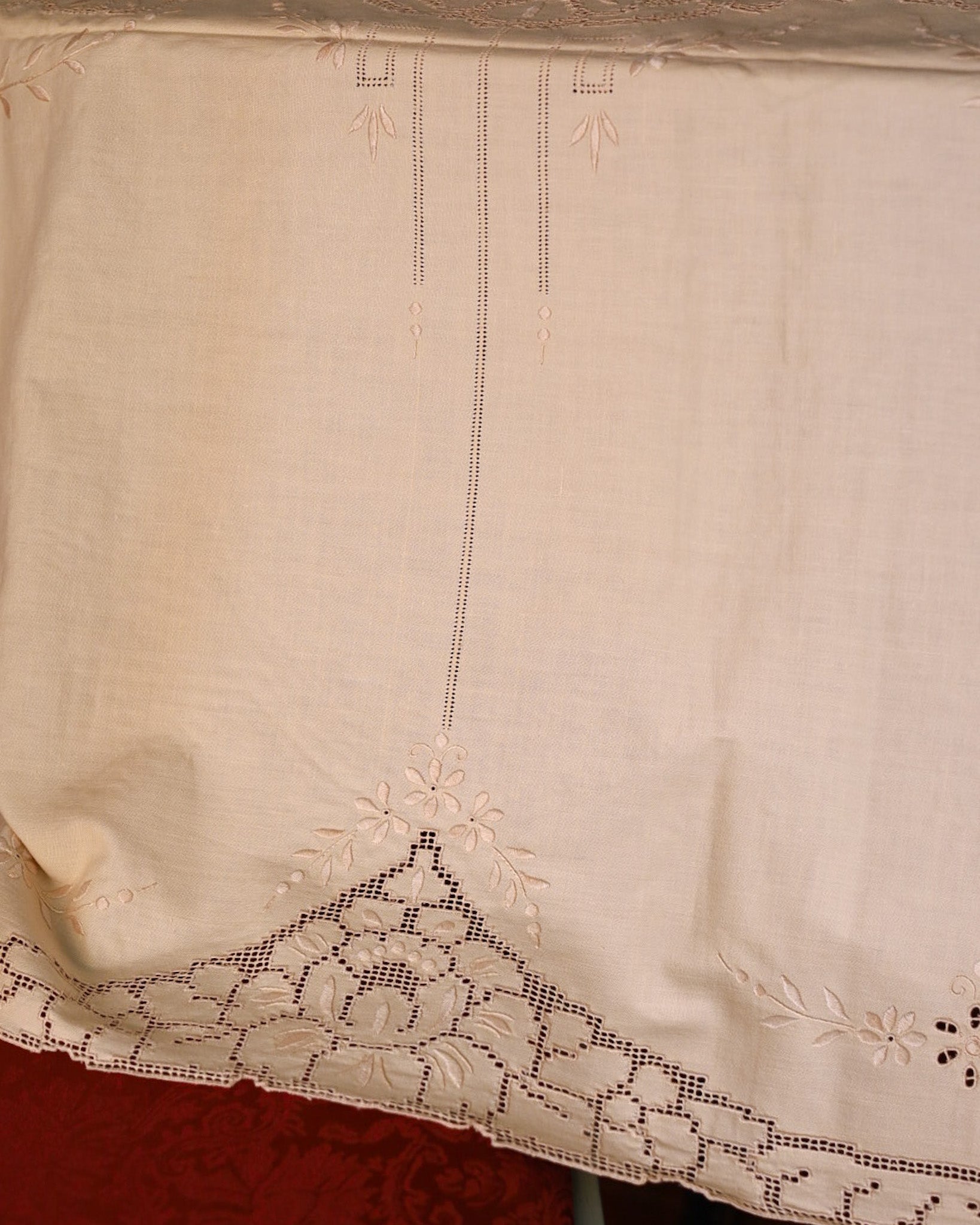 Stupenda tovaglia in lino avorio con ricamo sfilato siciliano