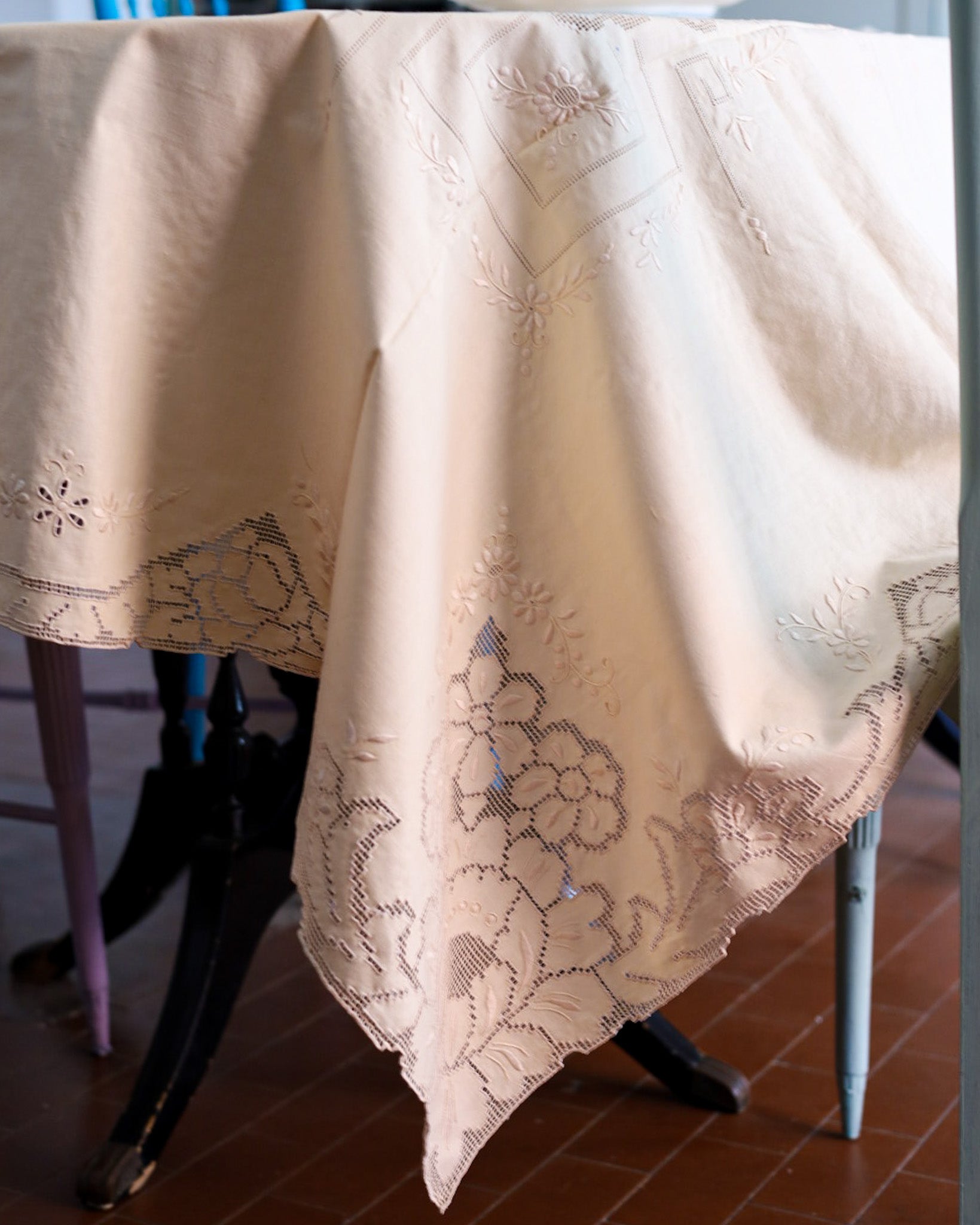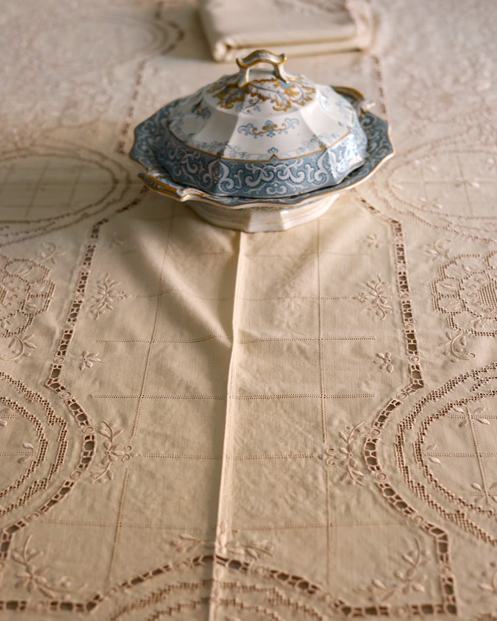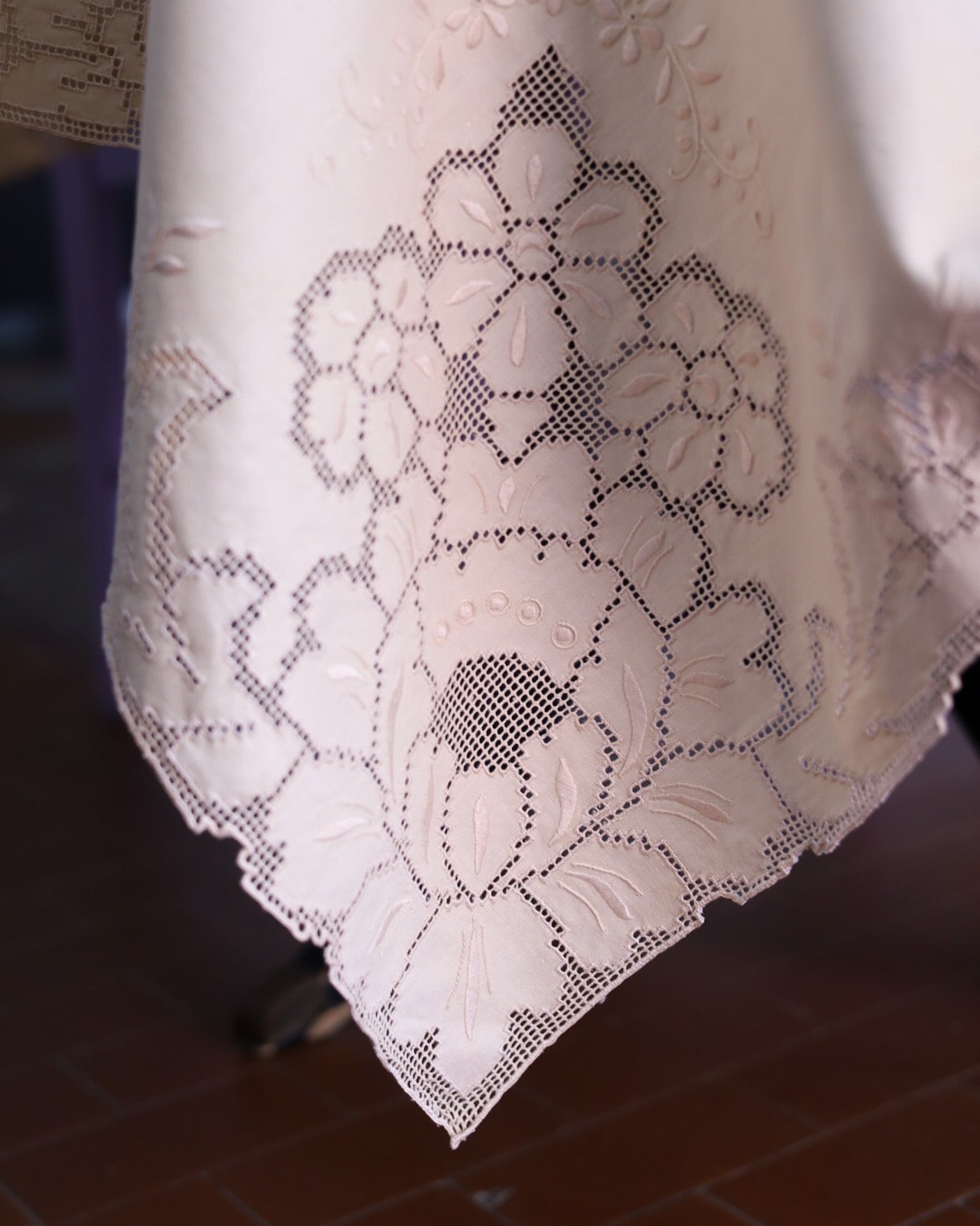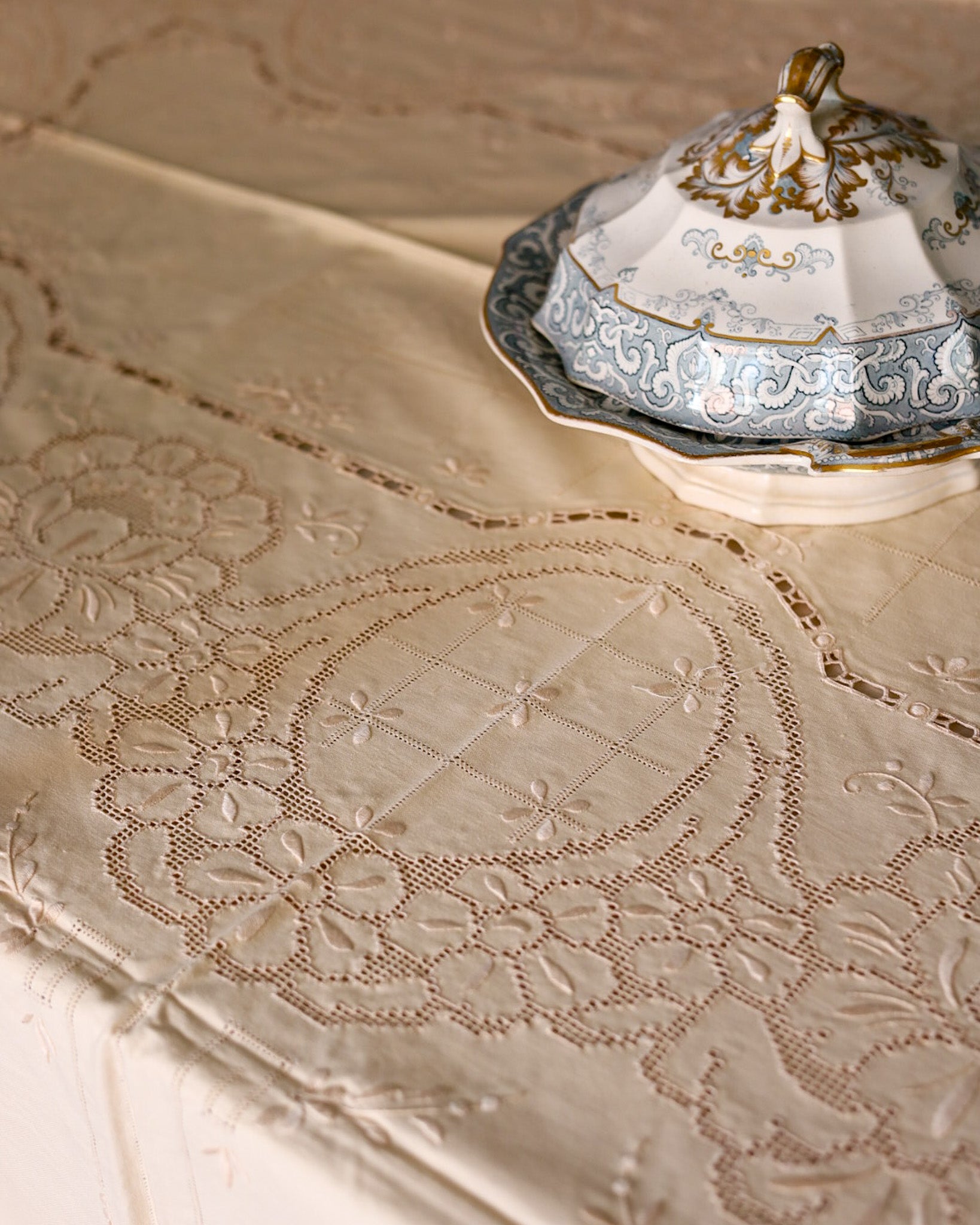 Stupenda tovaglia in lino avorio con ricamo sfilato siciliano