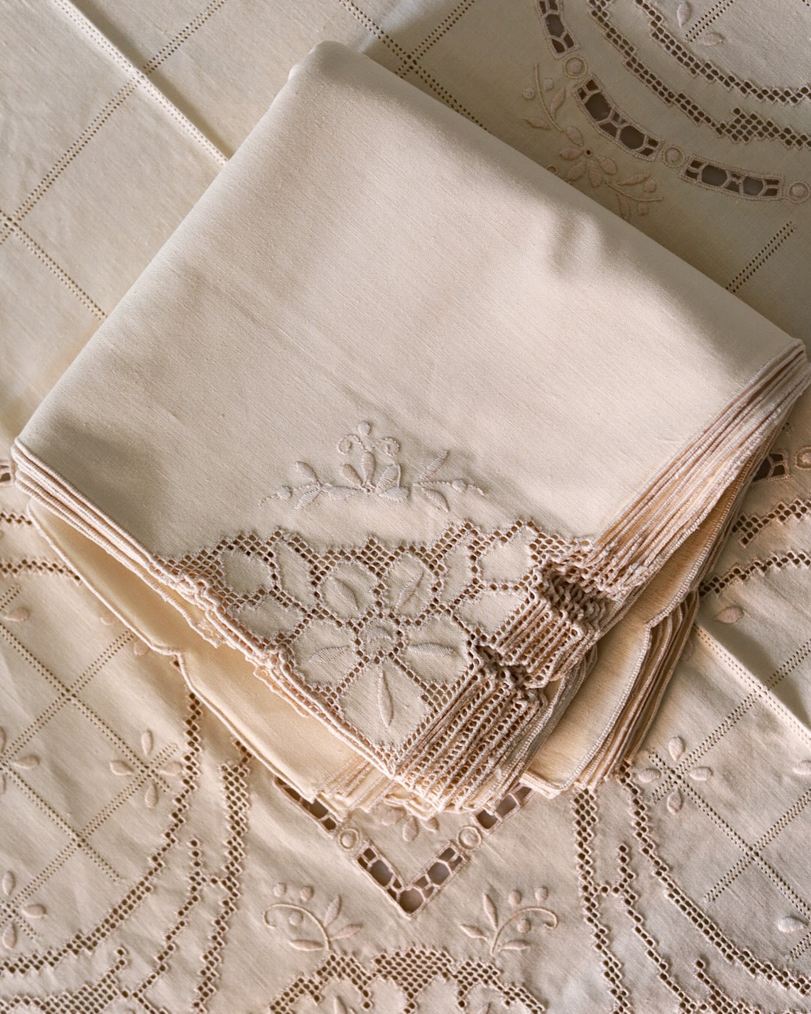 Tovaglia in lino avorio sfilato siciliano con 12 tovaglioli