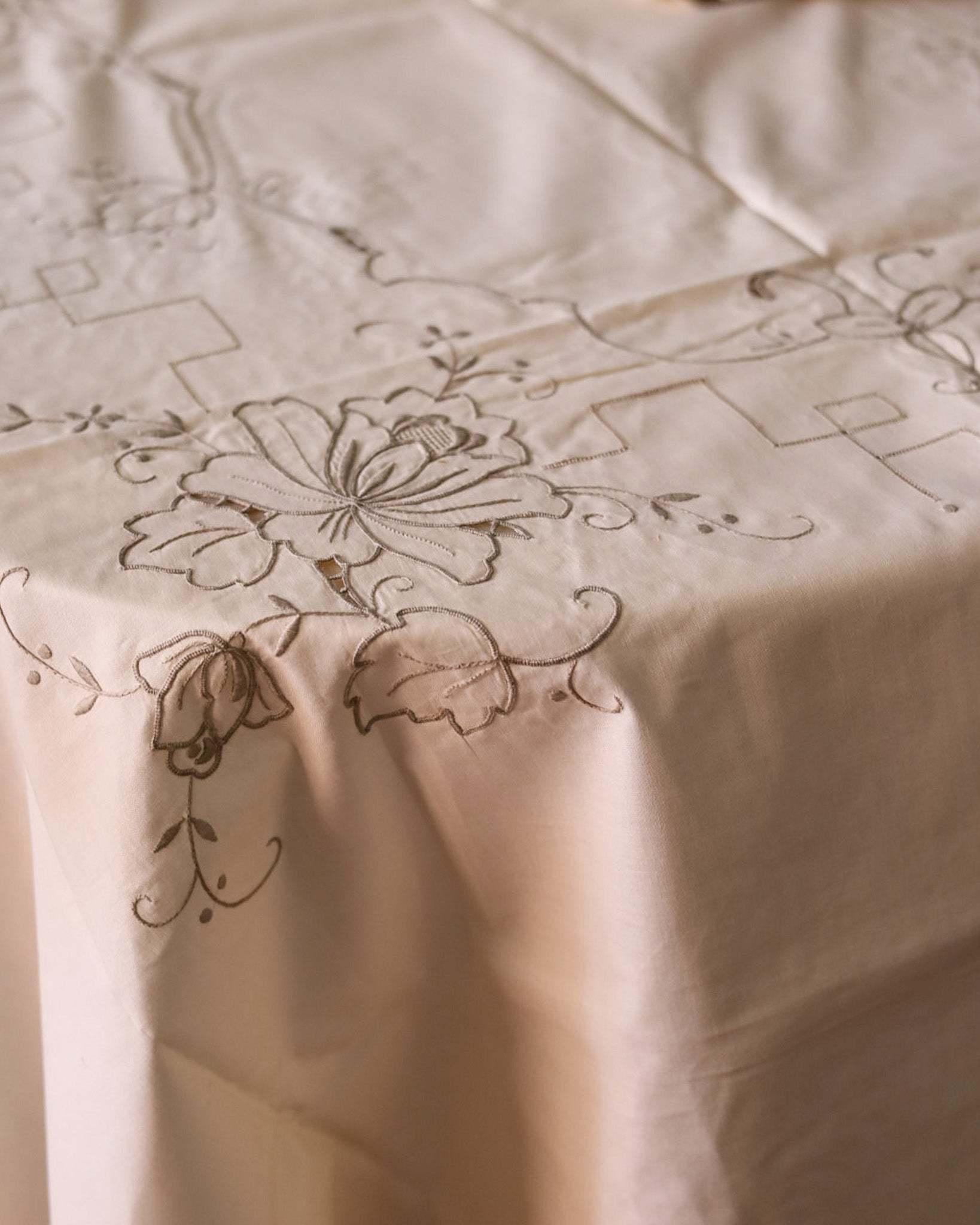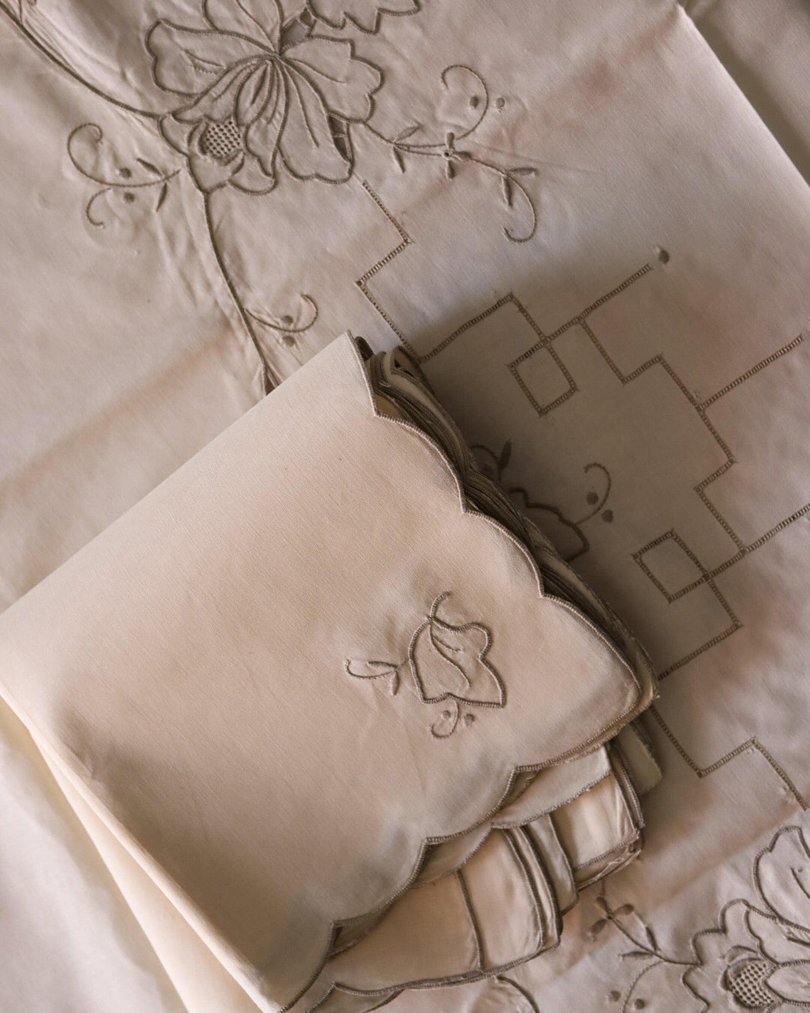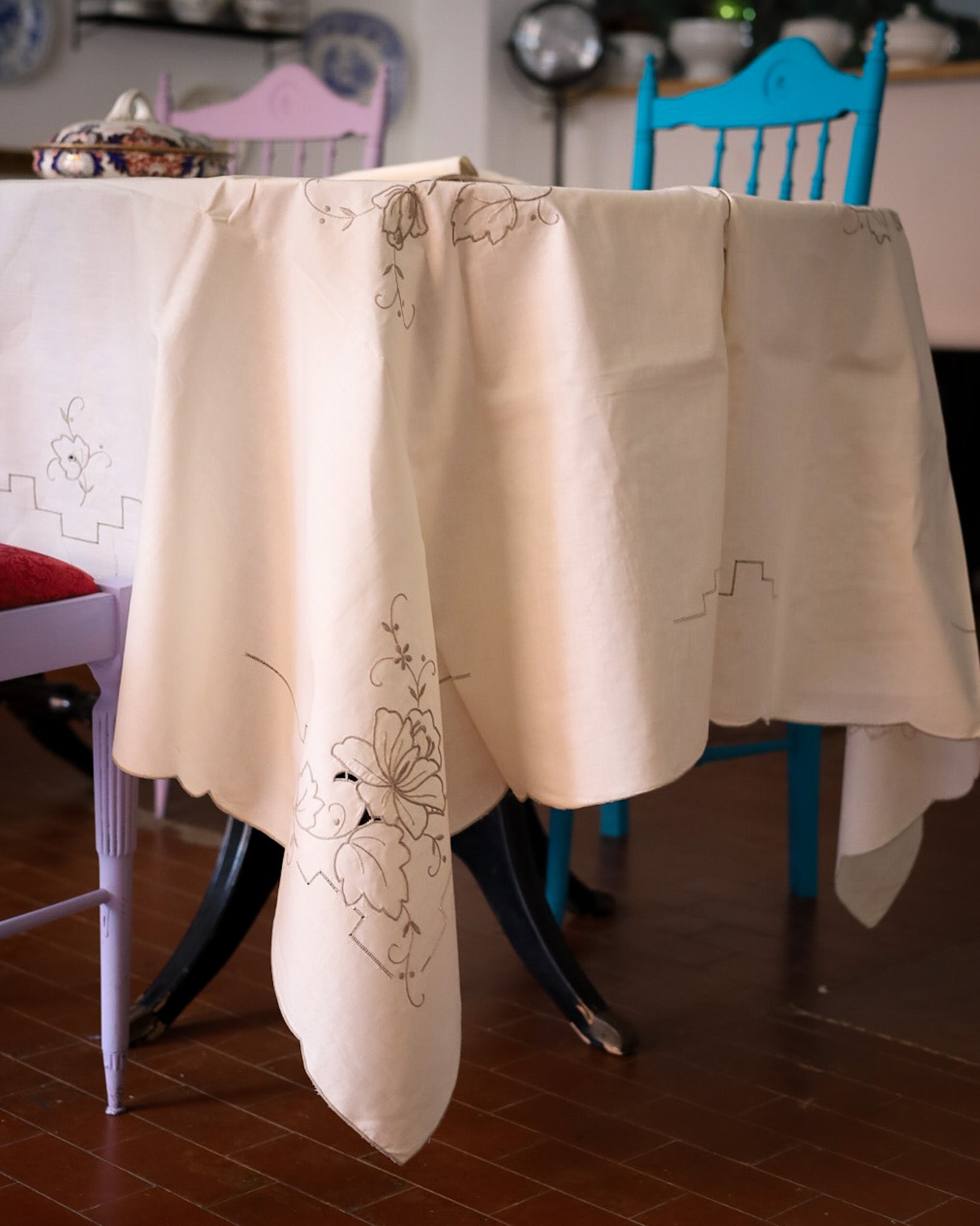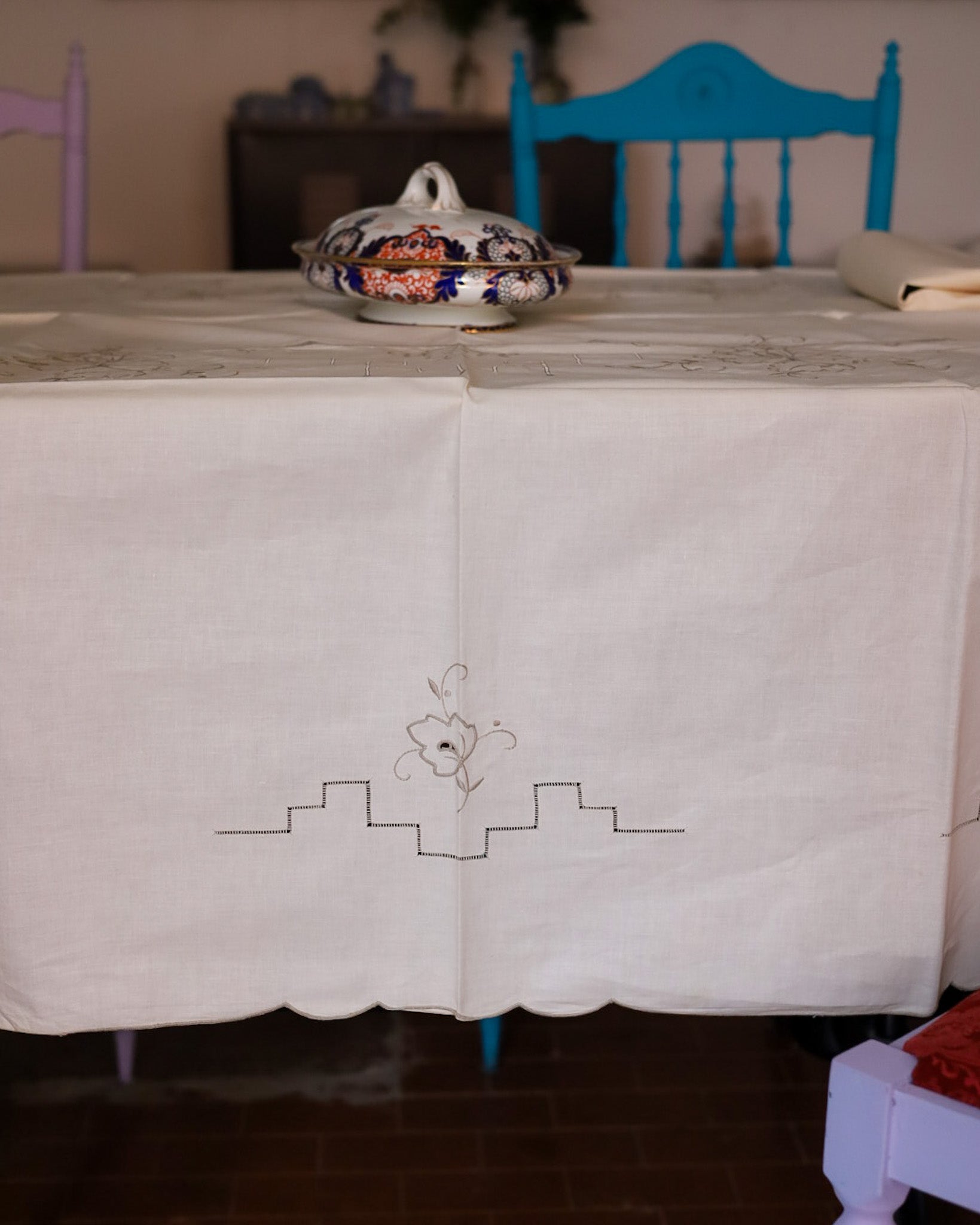 tovaglia in misto lino avorio con ricamo grigio e 12 tovaglioli