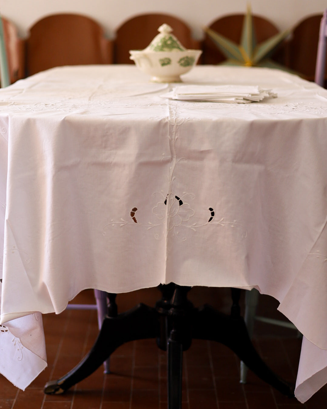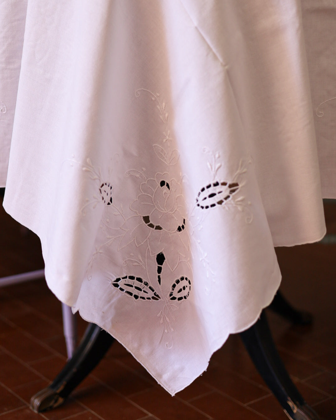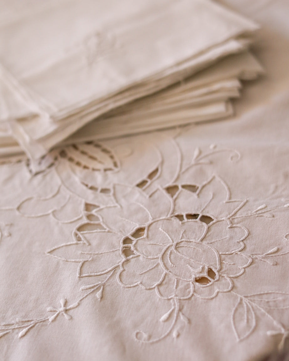 Tovaglia in misto lino con ricamo intaglio e 12 tovaglioli
