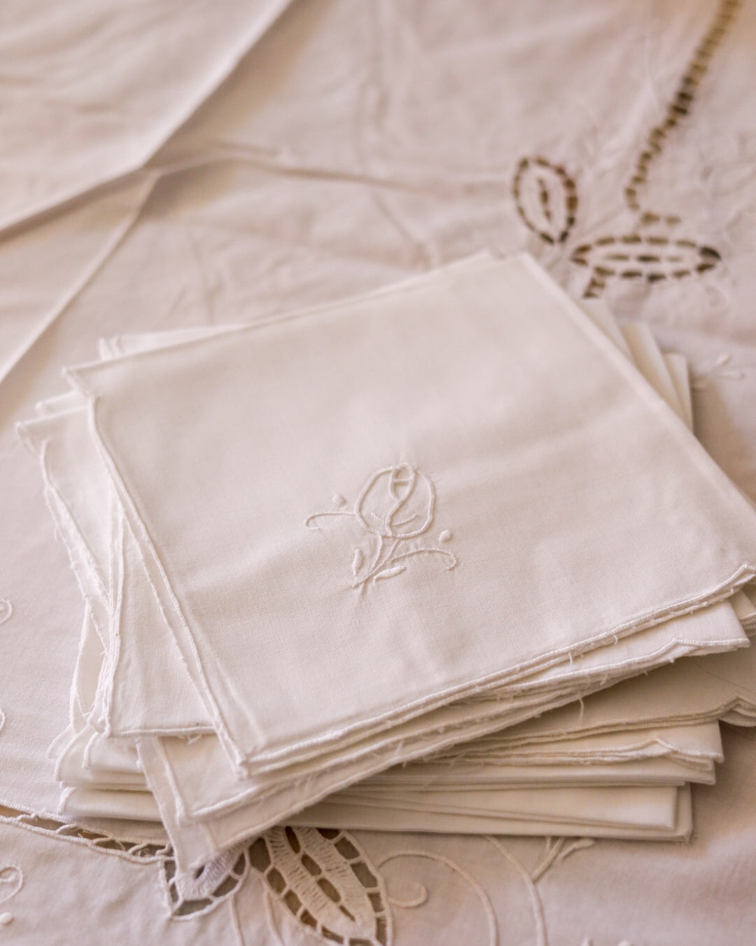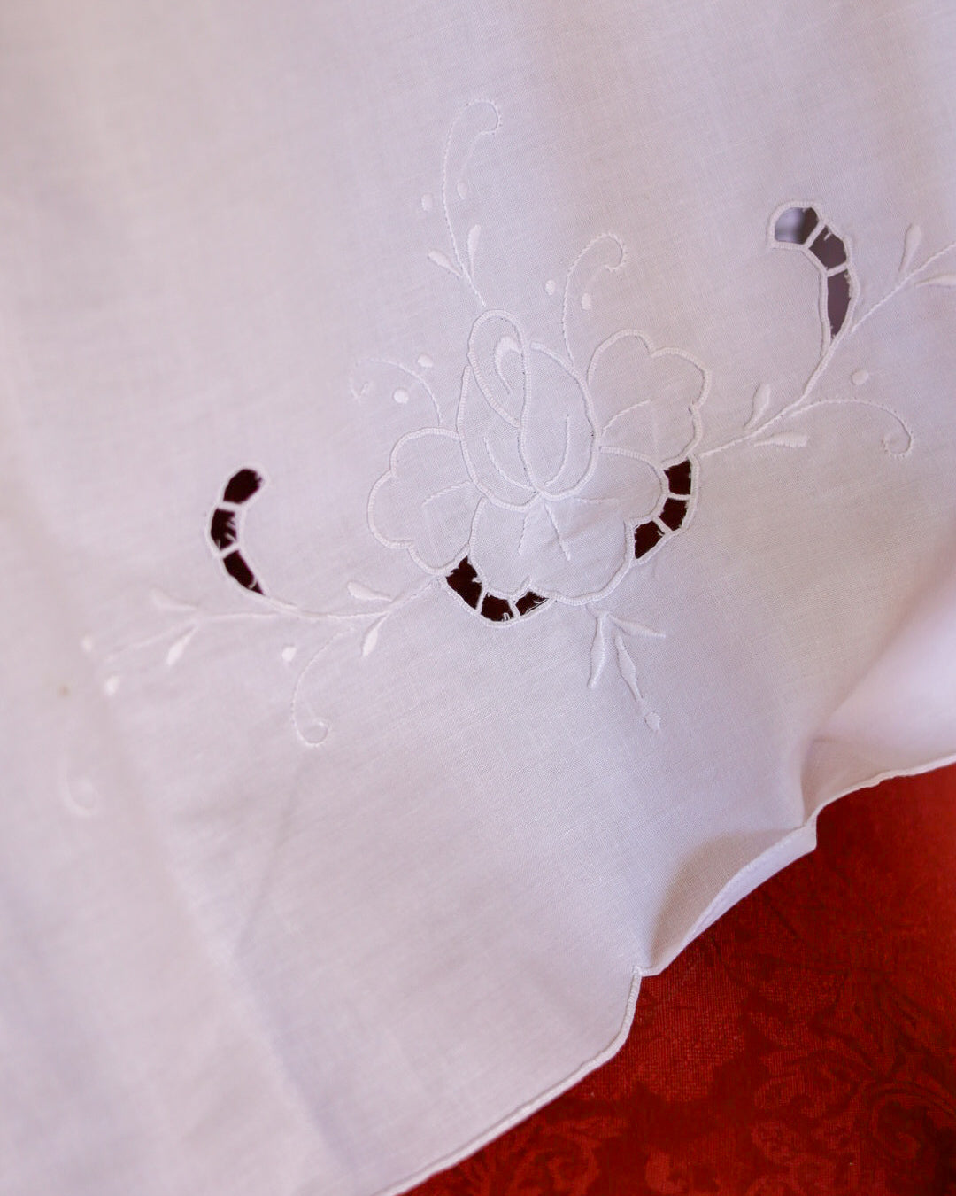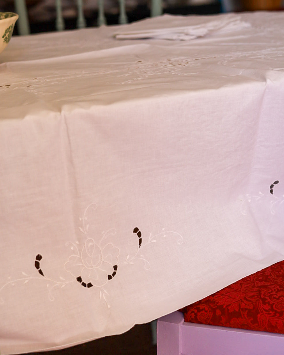 Tovaglia in misto lino con ricamo intaglio e 12 tovaglioli