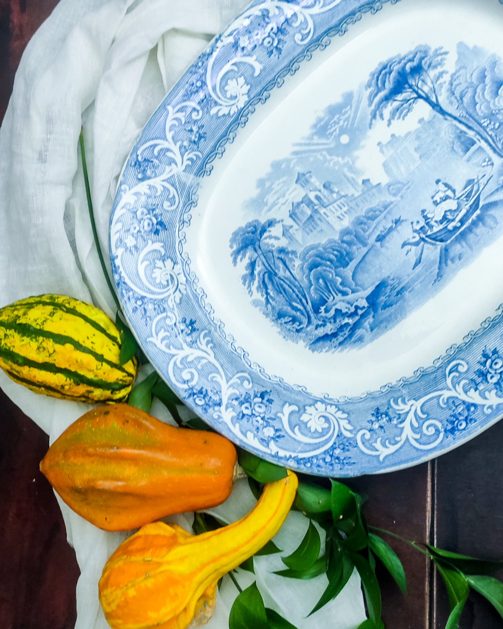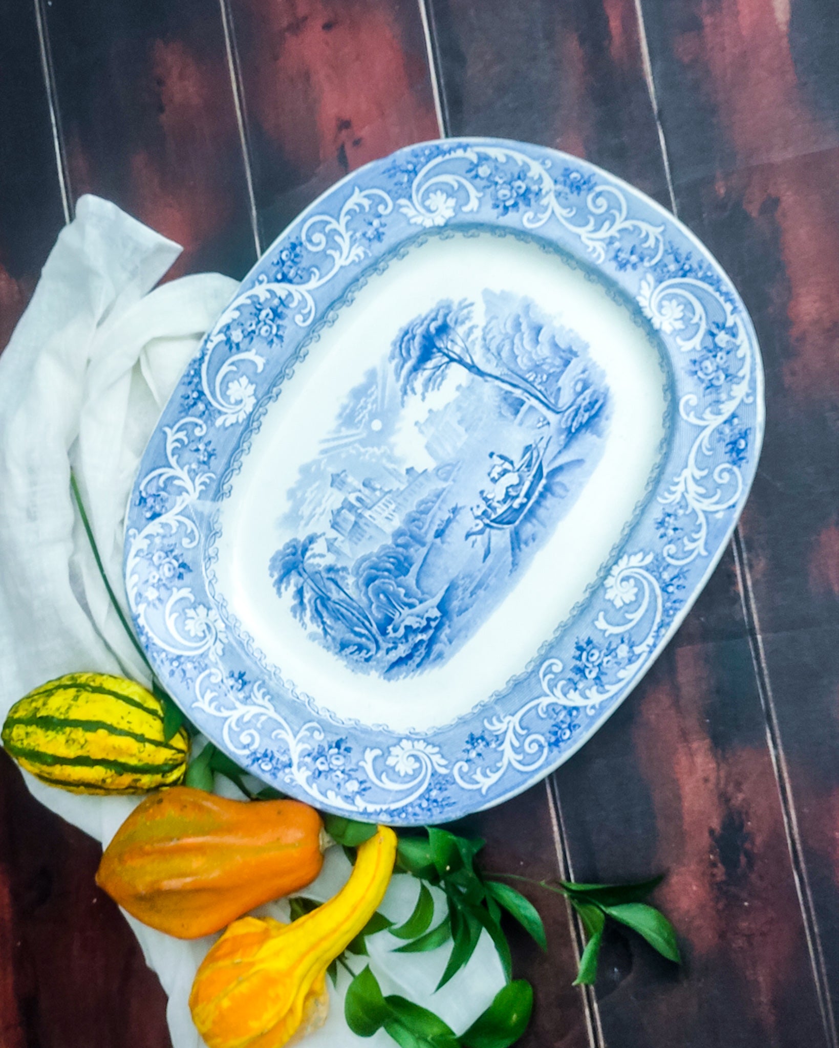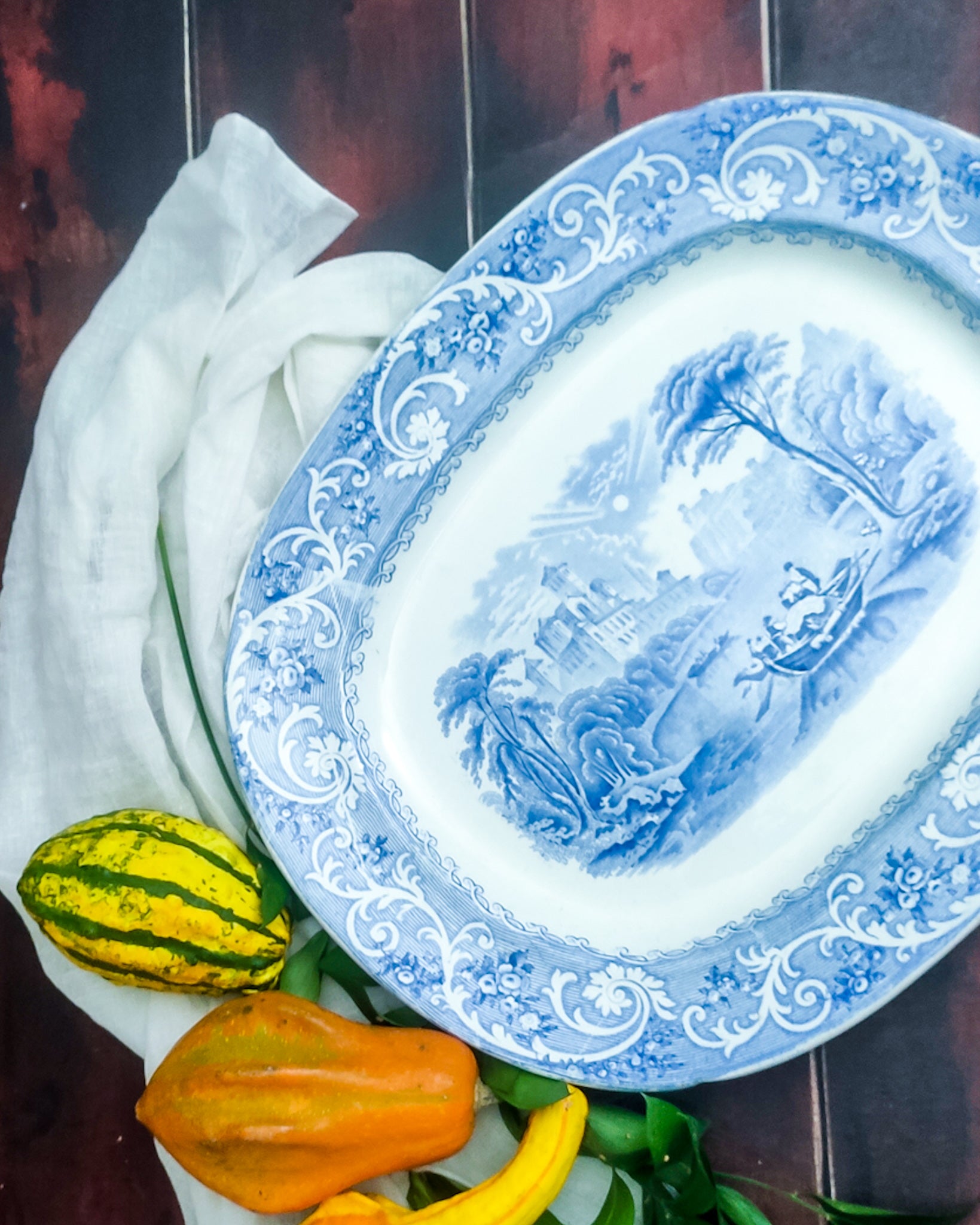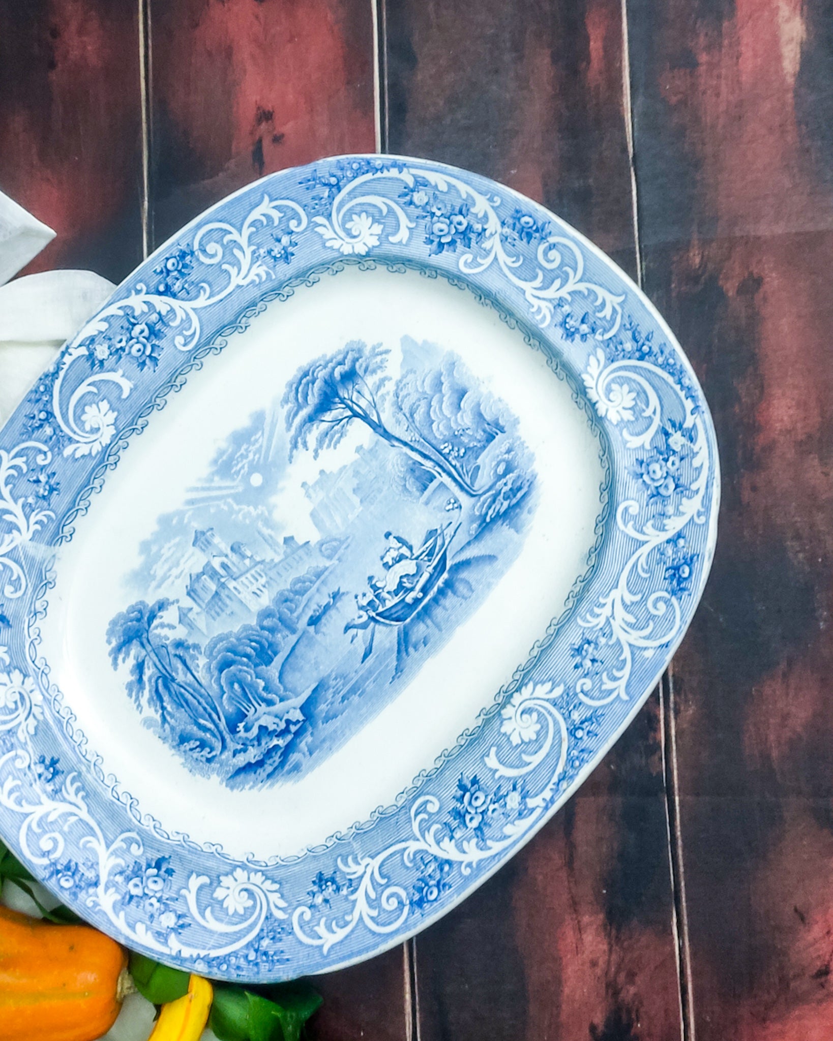 Stupendo vassoio ovale con paesaggio azzurro a transfer